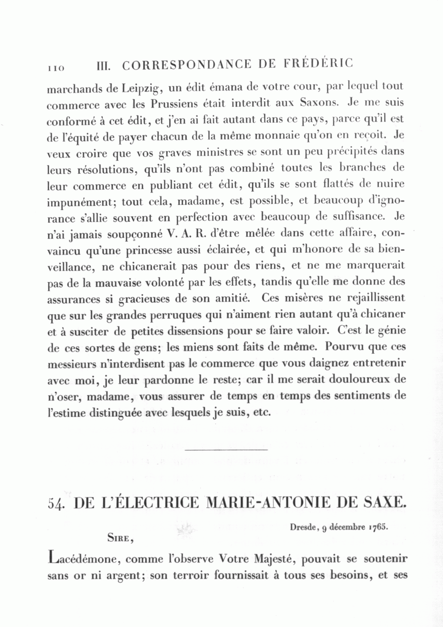 <110> marchands de Leipzig, un édit émana de votre cour, par lequel tout commerce avec les Prussiens était interdit aux Saxons. Je me suis conformé à cet édit, et j'en ai fait autant dans ce pays, parce qu'il est de l'équité de payer chacun de la même monnaie qu'on en reçoit. Je veux croire que vos graves ministres se sont un peu précipités dans leurs résolutions, qu'ils n'ont pas combiné toutes les branches de leur commerce en publiant cet édit, qu'ils se sont flattés de nuire impunément; tout cela, madame, est possible, et beaucoup d'ignorance s'allie souvent en perfection avec beaucoup de suffisance. Je n'ai jamais soupçonné V. A. R. d'être mêlée dans cette affaire, convaincu qu'une princesse aussi éclairée, et qui m'honore de sa bienveillance, ne chicanerait pas pour des riens, et ne me marquerait pas de la mauvaise volonté par les effets, tandis qu'elle me donne des assurances si gracieuses de son amitié. Ces misères ne rejaillissent que sur les grandes perruques qui n'aiment rien autant qu'à chicaner et à susciter de petites dissensions pour se faire valoir. C'est le génie de ces sortes de gens; les miens sont faits de même. Pourvu que ces messieurs n'interdisent pas le commerce que vous daignez entretenir avec moi, je leur pardonne le reste; car il me serait douloureux de n'oser, madame, vous assurer de temps en temps des sentiments de l'estime distinguée avec lesquels je suis, etc.