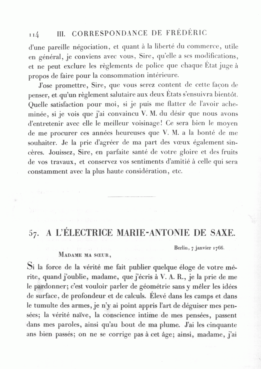 Si la force de la vérité me fait publier quelque éloge de votre mérite, quand j'oublie, madame, que j'écris à V. A. R., je la prie de me le pardonner; c'est vouloir parler de géométrie sans y mêler les idées de surface, de profondeur et de calculs. Élevé dans les camps et dans le tumulte des armes, je n'y ai point appris l'art de déguiser mes pensées; la vérité naïve, la conscience intime de mes pensées, passent dans mes paroles, ainsi qu'au bout de ma plume. J'ai les cinquante ans bien passés; on ne se corrige pas à cet âge; ainsi, madame, j'ai