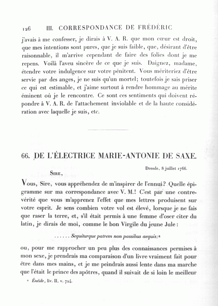 Vous, Sire, vous appréhendez de m'inspirer de l'ennui? Quelle épigramme sur ma correspondance avec V. M.! C'est par une contrevérité que vous m'apprenez l'effet que mes lettres produisent sur votre esprit. Je sens combien votre vol est élevé, lorsque je ne fais que raser la terre, et, s'il était permis à une femme d'oser citer du latin, je dirais de moi, comme le bon Virgile du jeune Jule :