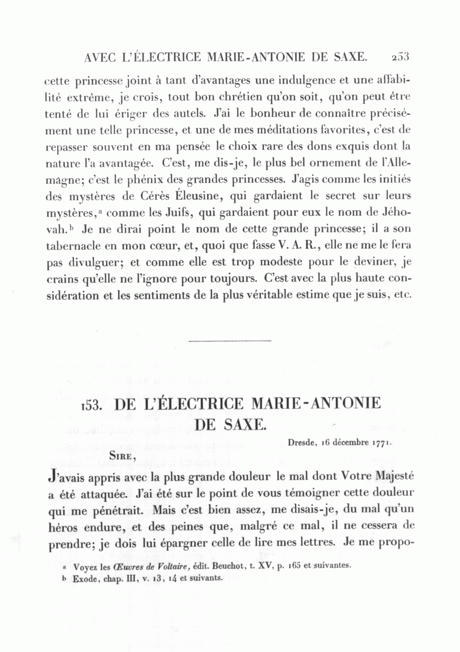 <253> cette princesse joint à tant d'avantages une indulgence et une affabilité extrême, je crois, tout bon chrétien qu'on soit, qu'on peut être tenté de lui ériger des autels. J'ai le bonheur de connaître précisément une telle princesse, et une de mes méditations favorites, c'est de repasser souvent en ma pensée le choix rare des dons exquis dont la nature l'a avantagée. C'est, me dis-je, le plus bel ornement de l'Allemagne; c'est le phénix des grandes princesses. J'agis comme les initiés des mystères de Cérès Éleusine, qui gardaient le secret sur leurs mystères,a comme les Juifs, qui gardaient pour eux le nom de Jéhovah.b Je ne dirai point le nom de cette grande princesse; il a son tabernacle en mon cœur, et, quoi que fasse V. A. R., elle ne me le fera pas divulguer; et comme elle est trop modeste pour le deviner, je crains qu'elle ne l'ignore pour toujours. C'est avec la plus haute considération et les sentiments de la plus véritable estime que je suis, etc.