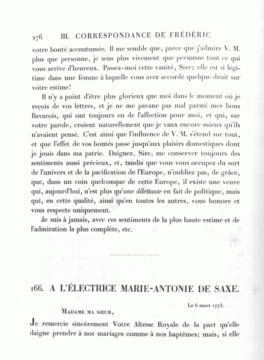 Il n'y a point d'être plus glorieux que moi dans le moment où je reçois de vos lettres, et je ne me pavane pas mal parmi mes bons Bavarois, qui ont toujours eu de l'affection pour moi, et qui, sur votre parole, croient naturellement que je vaux encore mieux qu'ils n'avaient pensé. C'est ainsi que l'influence de V. M. s'étend sur tout, et que l'effet de vos bontés passe jusqu'aux plaisirs domestiques dont je jouis dans ma patrie. Daignez, Sire, me conserver toujours des sentiments aussi précieux, et, tandis que vous vous occupez du sort de l'univers et de la pacification de l'Europe, n'oubliez pas, de grâce, que, dans un coin quelconque de cette Europe, il existe une veuve qui, aujourd'hui, n'est plus qu'une dilettante en fait de politique, mais qui, en cette qualité, ainsi qu'en toutes les autres, vous honore et vous respecte uniquement.