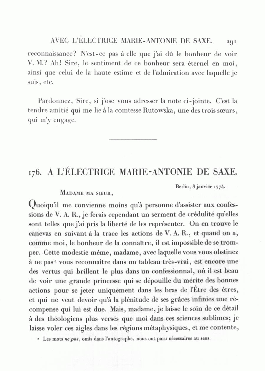 Quoiqu'il me convienne moins qu'à personne d'assister aux confessions de V. A. R., je ferais cependant un serment de crédulité qu'elles sont telles que j'ai pris la liberté de les représenter. On en trouve le canevas en suivant à la trace les actions de V. A. R., et quand on a, comme moi, le bonheur de la connaître, il est impossible de se tromper. Cette modestie même, madame, avec laquelle vous vous obstinez à ne pasa vous reconnaître dans un tableau très-vrai, est encore une des vertus qui brillent le plus dans un confessionnal, où il est beau de voir une grande princesse qui se dépouille du mérite des bonnes actions pour se jeter uniquement dans les bras de l'Être des êtres, et qui ne veut devoir qu'à la plénitude de ses grâces infinies une récompense qui lui est due. Mais, madame, je laisse le soin de ce détail à des théologiens plus versés que moi dans ces sciences sublimes; je laisse voler ces aigles dans les régions métaphysiques, et me contente,