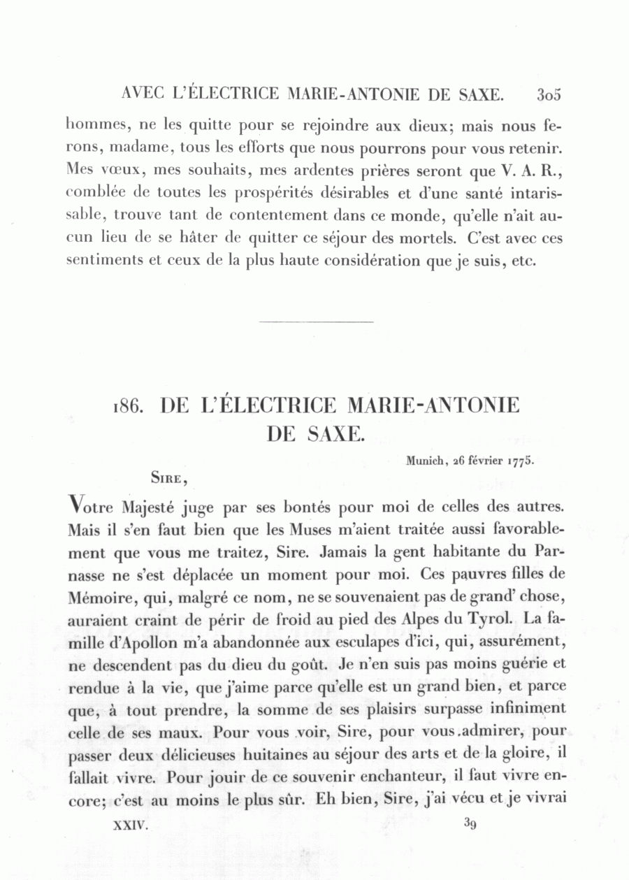 Votre Majesté juge par ses bontés pour moi de celles des autres. Mais il s'en faut bien que les Muses m'aient traitée aussi favorablement que vous me traitez, Sire. Jamais la gent habitante du Parnasse ne s'est déplacée un moment pour moi. Ces pauvres filles de Mémoire, qui, malgré ce nom, ne se souvenaient pas de grand' chose, auraient craint de périr de froid au pied des Alpes du Tyrol. La famille d'Apollon m'a abandonnée aux esculapes d'ici, qui, assurément, ne descendent pas du dieu du goût. Je n'en suis pas moins guérie et rendue à la vie, que j'aime parce qu'elle est un grand bien, et parce que, à tout prendre, la somme de ses plaisirs surpasse infiniment celle de ses maux. Pour vous voir, Sire, pour vous admirer, pour passer deux délicieuses huitaines au séjour des arts et de la gloire, il fallait vivre. Pour jouir de ce souvenir enchanteur, il faut vivre encore; c'est au moins le plus sûr. Eh bien, Sire, j'ai vécu et je vivrai