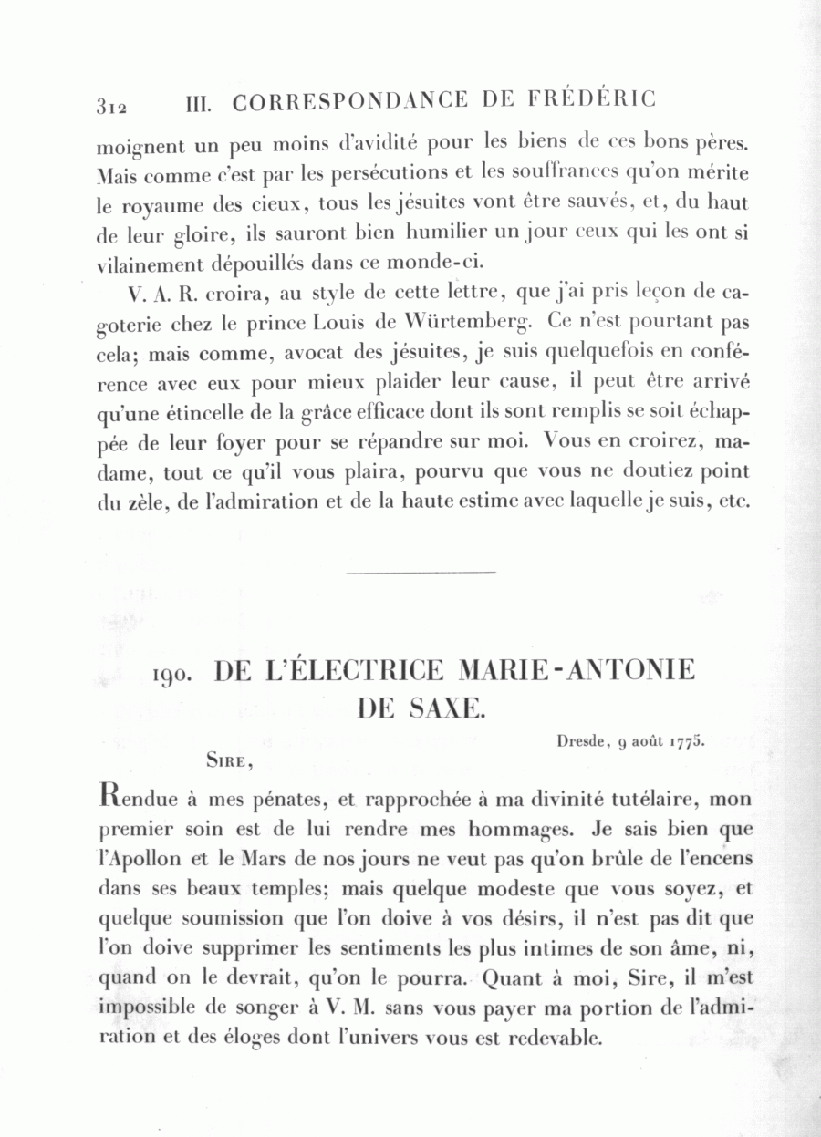 Rendue à mes pénates, et rapprochée à ma divinité tutélaire, mon premier soin est de lui rendre mes hommages. Je sais bien que l'Apollon et le Mars de nos jours ne veut pas qu'on brûle de l'encens dans ses beaux temples; mais quelque modeste que vous soyez, et quelque soumission que l'on doive à vos désirs, il n'est pas dit que l'on doive supprimer les sentiments les plus intimes de son âme, ni, quand on le devrait, qu'on le pourra. Quant à moi, Sire, il m'est impossible de songer à V. M. sans vous payer ma portion de l'admiration et des éloges dont l'univers vous est redevable.