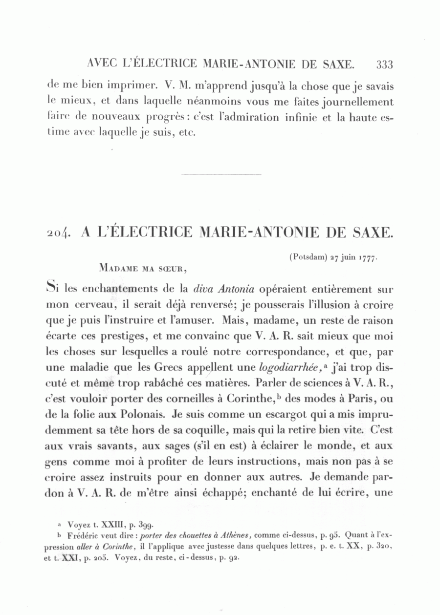 b Frédéric veut dire : porter des chouettes à Athènes, comme ci-dessus, p. 95. Quant à l'expression aller à Corinthe, il l'applique avec justesse dans quelques lettres, p. e. t. XX, p. 320, et t. XXI, p. 205. Voyez, du reste, ci-dessus, p. 92.