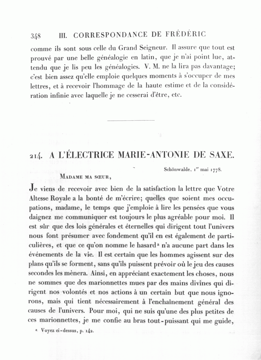 Je viens de recevoir avec bien de la satisfaction la lettre que Votre Altesse Royale a la bonté de m'écrire; quelles que soient mes occupations, madame, le temps que j'emploie à lire les pensées que vous daignez me communiquer est toujours le plus agréable pour moi. Il est sûr que des lois générales et éternelles qui dirigent tout l'univers nous font présumer avec fondement qu'il en est également de particulières, et que ce qu'on nomme le hasarda n'a aucune part dans les événements de la vie. Il est certain que les hommes agissent sur des plans qu'ils se forment, sans qu'ils puissent prévoir où le jeu des causes secondes les mènera. Ainsi, en appréciant exactement les choses, nous ne sommes que des marionnettes mues par des mains divines qui dirigent nos volontés et nos actions à un certain but que nous ignorons, mais qui tient nécessairement à l'enchaînement général des causes de l'univers. Pour moi, qui ne suis qu'une des plus petites de ces marionnettes, je me confie au bras tout-puissant qui me guide,
