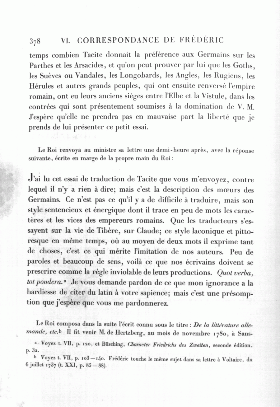 Le Roi composa dans la suite l'écrit connu sous le titre : De la littérature allemande, etc.b Il fit venir M. de Hertzberg, au mois de novembre 1780, à Sans-