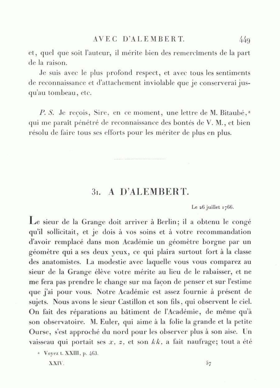 Le sieur de la Grange doit arriver à Berlin; il a obtenu le congé qu'il sollicitait, et je dois à vos soins et à votre recommandation d'avoir remplacé dans mon Académie un géomètre borgne par un géomètre qui a ses deux yeux, ce qui plaira surtout fort à la classe des anatomistes. La modestie avec laquelle vous vous comparez au sieur de la Grange élève votre mérite au lieu de le rabaisser, et ne me fera pas prendre le change sur ma façon de penser et sur l'estime que j'ai pour vous. Notre Académie est assez fournie à présent de sujets. Nous avons le sieur Castillon et son fils, qui observent le ciel. On fait des réparations au bâtiment de l'Académie, de même qu'à son observatoire. M. Euler, qui aime à la folie la grande et la petite Ourse, s'est approché du nord pour les observer plus à son aise. Un vaisseau qui portait ses x, z, et son kk, a fait naufrage; tout a été