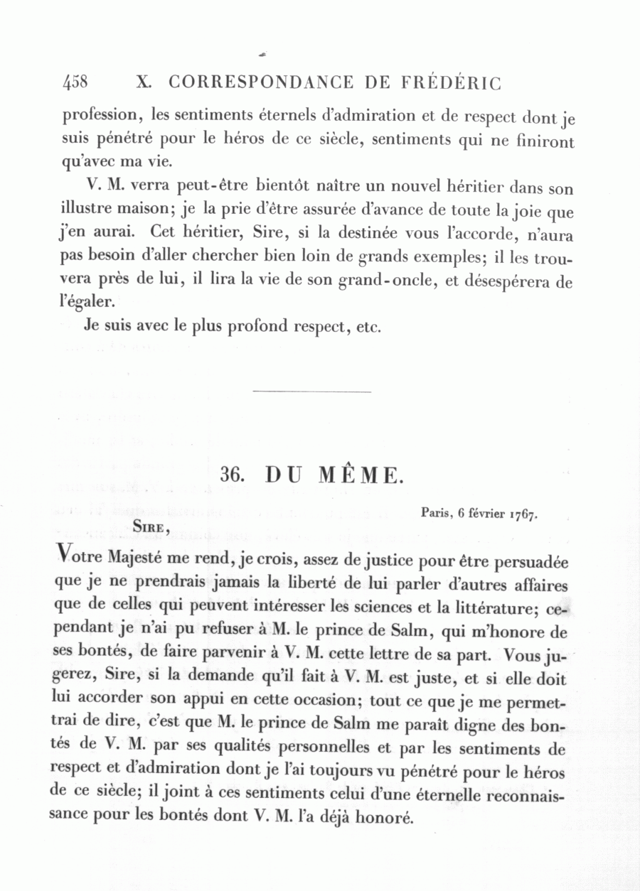 Votre Majesté me rend, je crois, assez de justice pour être persuadée que je ne prendrais jamais la liberté de lui parler d'autres affaires que de celles qui peuvent intéresser les sciences et la littérature; cependant je n'ai pu refuser à M. le prince de Salm, qui m'honore de ses bontés, de faire parvenir à V. M. cette lettre de sa part. Vous jugerez, Sire, si la demande qu'il fait à V. M. est juste, et si elle doit lui accorder son appui en cette occasion; tout ce que je me permettrai de dire, c'est que M. le prince de Salm me paraît digne des bontés de V. M. par ses qualités personnelles et par les sentiments de respect et d'admiration dont je l'ai toujours vu pénétré pour le héros de ce siècle; il joint à ces sentiments celui d'une éternelle reconnaissance pour les bontés dont V. M. l'a déjà honoré.