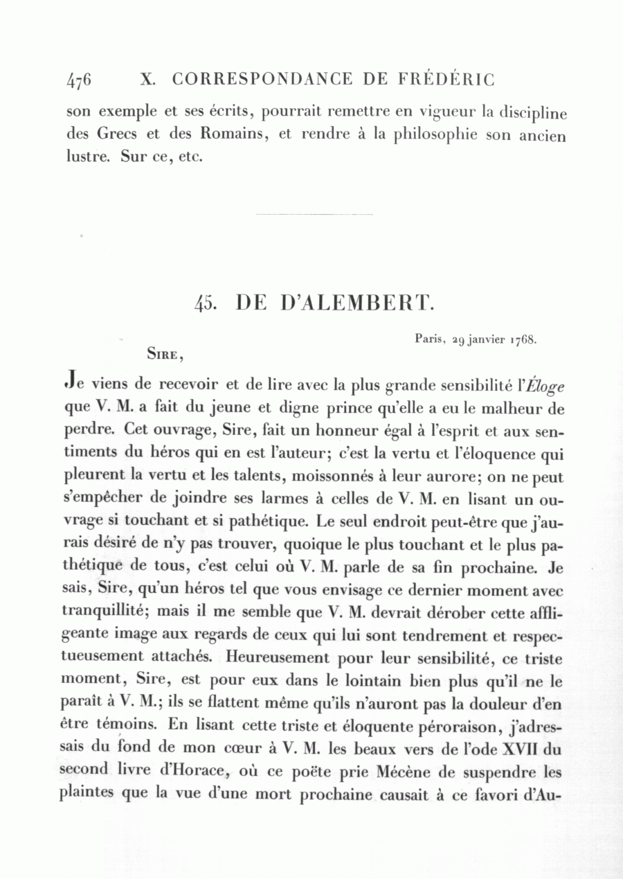 Je viens de recevoir et de lire avec la plus grande sensibilité l'Éloge que V. M. a fait du jeune et digne prince qu'elle a eu le malheur de perdre. Cet ouvrage, Sire, fait un honneur égal à l'esprit et aux sentiments du héros qui en est l'auteur; c'est la vertu et l'éloquence qui pleurent la vertu et les talents, moissonnés à leur aurore; on ne peut s'empêcher de joindre ses larmes à celles de V. M. en lisant un ouvrage si touchant et si pathétique. Le seul endroit peut-être que j'aurais désiré de n'y pas trouver, quoique le plus touchant et le plus pathétique de tous, c'est celui où V. M. parle de sa fin prochaine. Je sais, Sire, qu'un héros tel que vous envisage ce dernier moment avec tranquillité; mais il me semble que V. M. devrait dérober cette affligeante image aux regards de ceux qui lui sont tendrement et respectueusement attachés. Heureusement pour leur sensibilité, ce triste moment, Sire, est pour eux dans le lointain bien plus qu'il ne le paraît à V. M.; ils se flattent même qu'ils n'auront pas la douleur d'en être témoins. En lisant cette triste et éloquente péroraison, j'adressais du fond de mon cœur à V. M. les beaux vers de l'ode XVII du second livre d'Horace, où ce poëte prie Mécène de suspendre les plaintes que la vue d'une mort prochaine causait à ce favori d'Au-