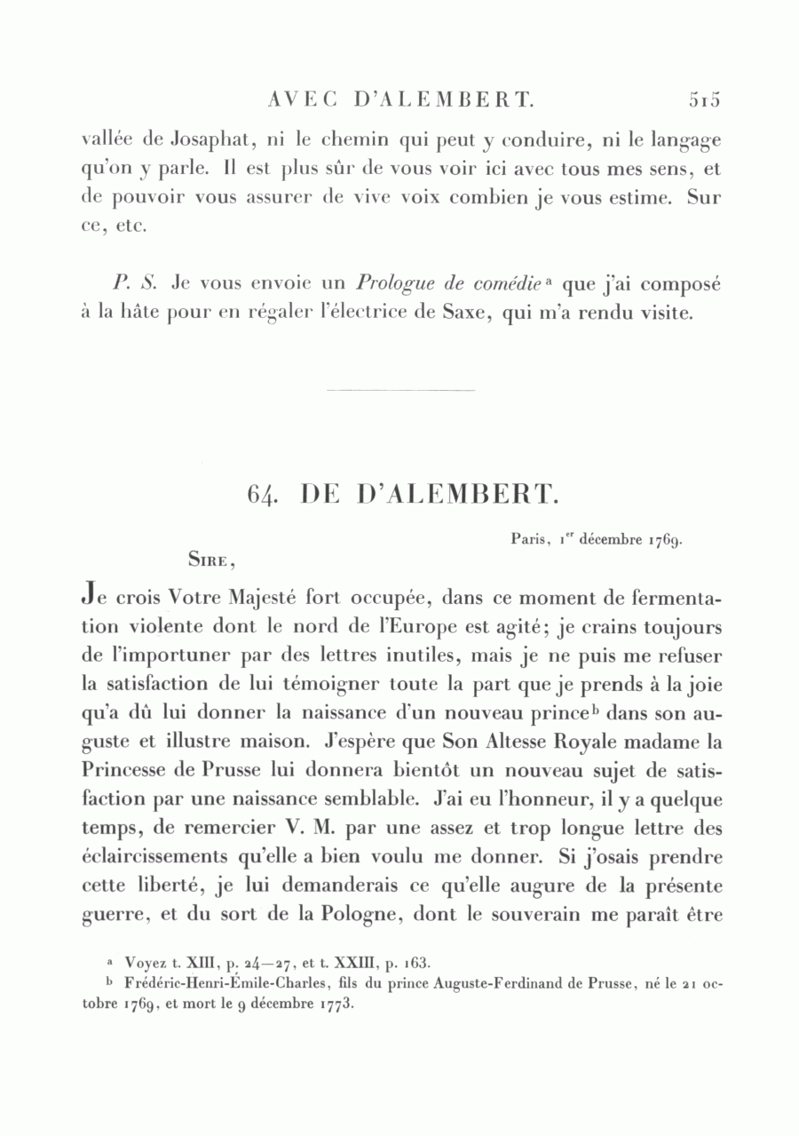 P. S. Je vous envoie un Prologue de comédiea que j'ai composé à la hâte pour en régaler l'électrice de Saxe, qui m'a rendu visite.
