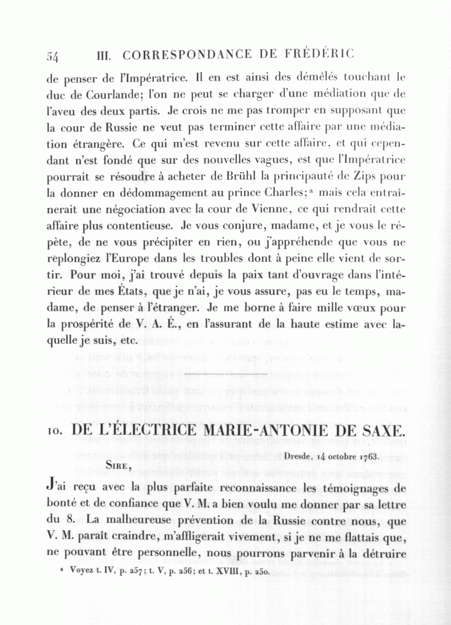 <54> de penser de l'Impératrice. Il en est ainsi des démêlés touchant le duc de Courlande; l'on ne peut se charger d'une médiation que de l'aveu des deux partis. Je crois ne me pas tromper en supposant que la cour de Russie ne veut pas terminer cette affaire par une médiation étrangère. Ce qui m'est revenu sur cette affaire, et qui cependant n'est fondé que sur des nouvelles vagues, est que l'Impératrice pourrait se résoudre à acheter de Brühl la principauté de Zips pour la donner en dédommagement au prince Charles;a mais cela entraînerait une négociation avec la cour de Vienne, ce qui rendrait cette affaire plus contentieuse. Je vous conjure, madame, et je vous le répète, de ne vous précipiter en rien, ou j'appréhende que vous ne replongiez l'Europe dans les troubles dont à peine elle vient de sortir. Pour moi, j'ai trouvé depuis la paix tant d'ouvrage dans l'intérieur de mes États, que je n'ai, je vous assure, pas eu le temps, madame, de penser à l'étranger. Je me borne à faire mille vœux pour la prospérité de V. A. É., en l'assurant de la haute estime avec laquelle je suis, etc.