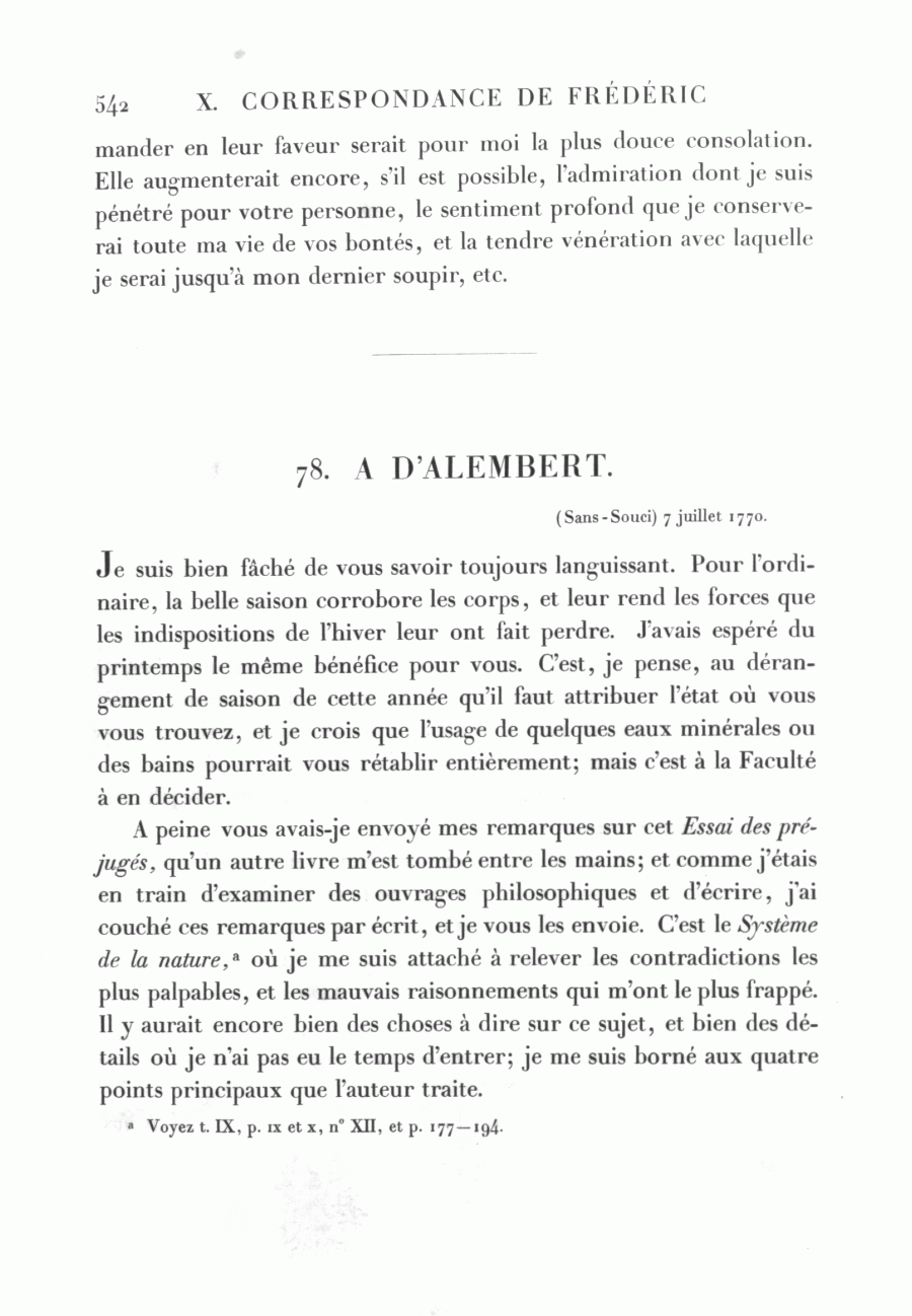 A peine vous avais-je envoyé mes remarques sur cet Essai des préjugés, qu'un autre livre m'est tombé entre les mains; et comme j'étais en train d'examiner des ouvrages philosophiques et d'écrire, j'ai couché ces remarques par écrit, et je vous les envoie. C'est le Système de la nature,a où je me suis attaché à relever les contradictions les plus palpables, et les mauvais raisonnements qui m'ont le plus frappé. Il y aurait encore bien des choses à dire sur ce sujet, et bien des détails où je n'ai pas eu le temps d'entrer; je me suis borné aux quatre points principaux que l'auteur traite.