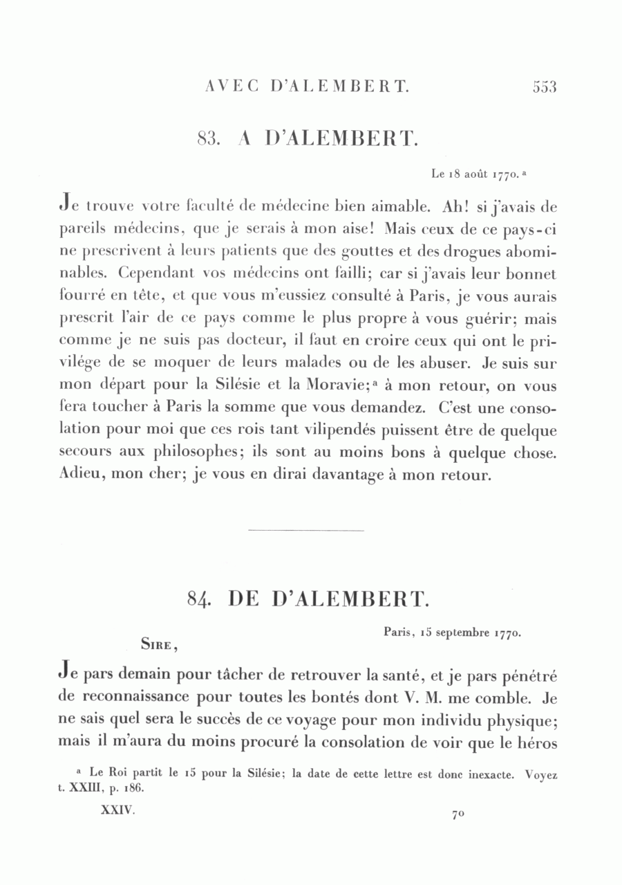 Je trouve votre faculté de médecine bien aimable. Ah! si j'avais de pareils médecins, que je serais à mon aise! Mais ceux de ce pays-ci ne prescrivent à leurs patients que des gouttes et des drogues abominables. Cependant vos médecins ont failli; car si j'avais leur bonnet fourré en tête, et que vous m'eussiez consulté à Paris, je vous aurais prescrit l'air de ce pays comme le plus propre à vous guérir; mais comme je ne suis pas docteur, il faut en croire ceux qui ont le privilége de se moquer de leurs malades ou de les abuser. Je suis sur mon départ pour la Silésie et la Moravie;a à mon retour, on vous fera toucher à Paris la somme que vous demandez. C'est une consolation pour moi que ces rois tant vilipendés puissent être de quelque secours aux philosophes; ils sont au moins bons à quelque chose. Adieu, mon cher; je vous en dirai davantage à mon retour.