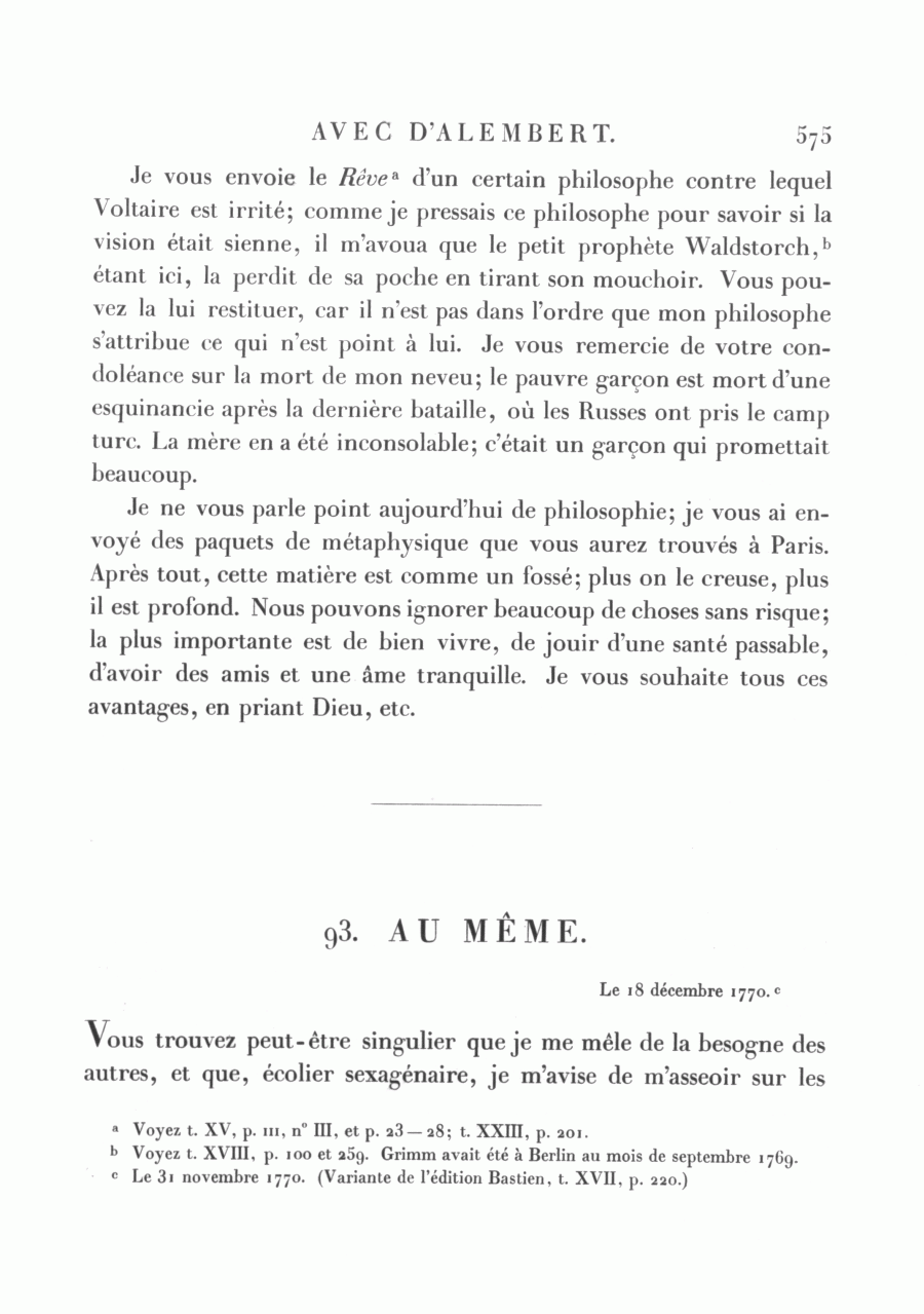<575>Je vous envoie le Rêvea d'un certain philosophe contre lequel Voltaire est irrité; comme je pressais ce philosophe pour savoir si la vision était sienne, il m'avoua que le petit prophète Waldstorch,b étant ici, la perdit de sa poche en tirant son mouchoir. Vous pouvez la lui restituer, car il n'est pas dans l'ordre que mon philosophe s'attribue ce qui n'est point à lui. Je vous remercie de votre condoléance sur la mort de mon neveu; le pauvre garçon est mort d'une esquinancie après la dernière bataille, où les Russes ont pris le camp turc. La mère en a été inconsolable; c'était un garçon qui promettait beaucoup.