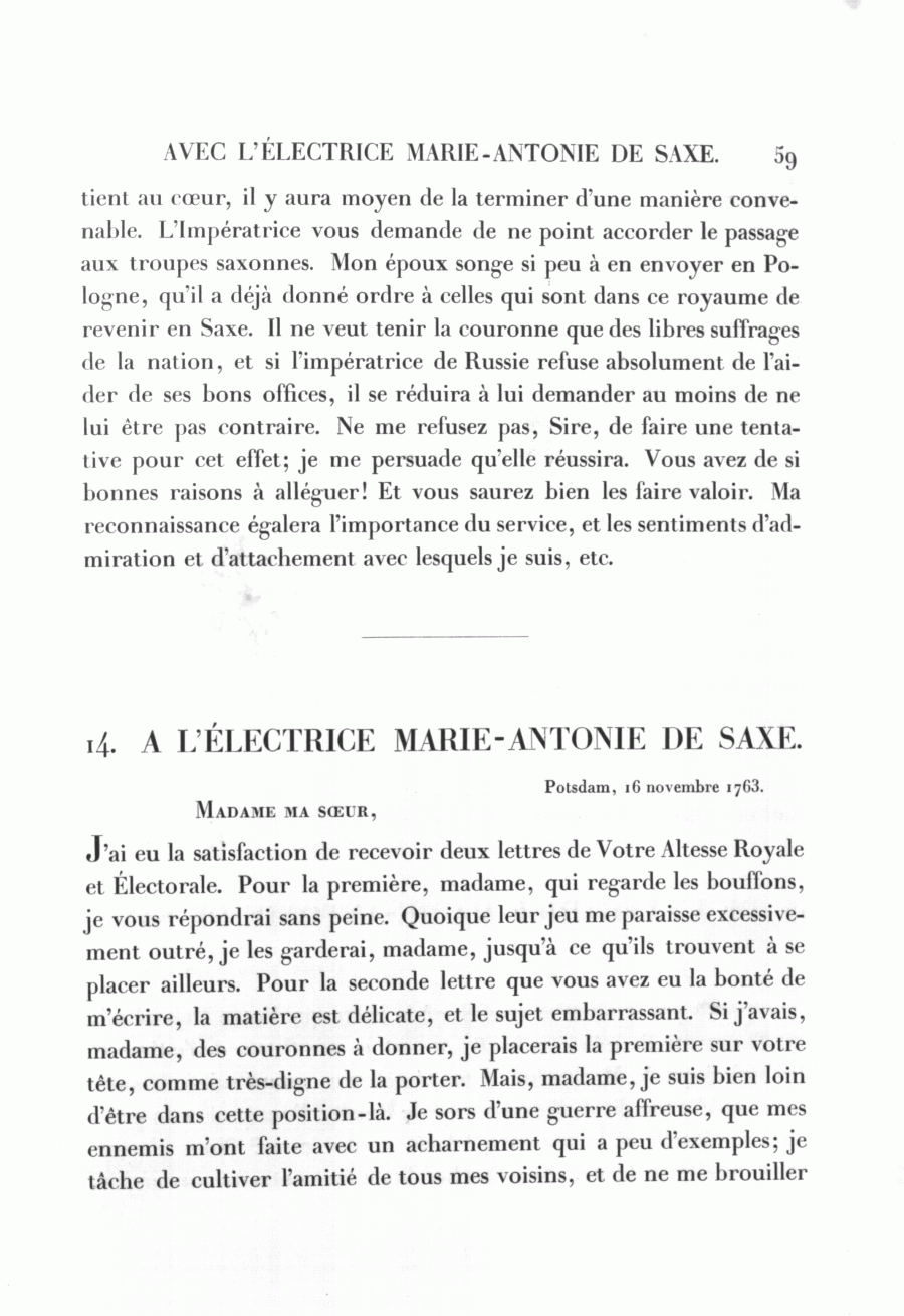 <59> tient au cœur, il y aura moyen de la terminer d'une manière convenable. L'Impératrice vous demande de ne point accorder le passage aux troupes saxonnes. Mon époux songe si peu à en envoyer en Pologne, qu'il a déjà donné ordre à celles qui sont dans ce royaume de revenir en Saxe. Il ne veut tenir la couronne que des libres suffrages de la nation, et si l'impératrice de Russie refuse absolument de l'aider de ses bons offices, il se réduira à lui demander au moins de ne lui être pas contraire. Ne me refusez pas, Sire, de faire une tentative pour cet effet; je me persuade qu'elle réussira. Vous avez de si bonnes raisons à alléguer! Et vous saurez bien les faire valoir. Ma reconnaissance égalera l'importance du service, et les sentiments d'admiration et d'attachement avec lesquels je suis, etc.