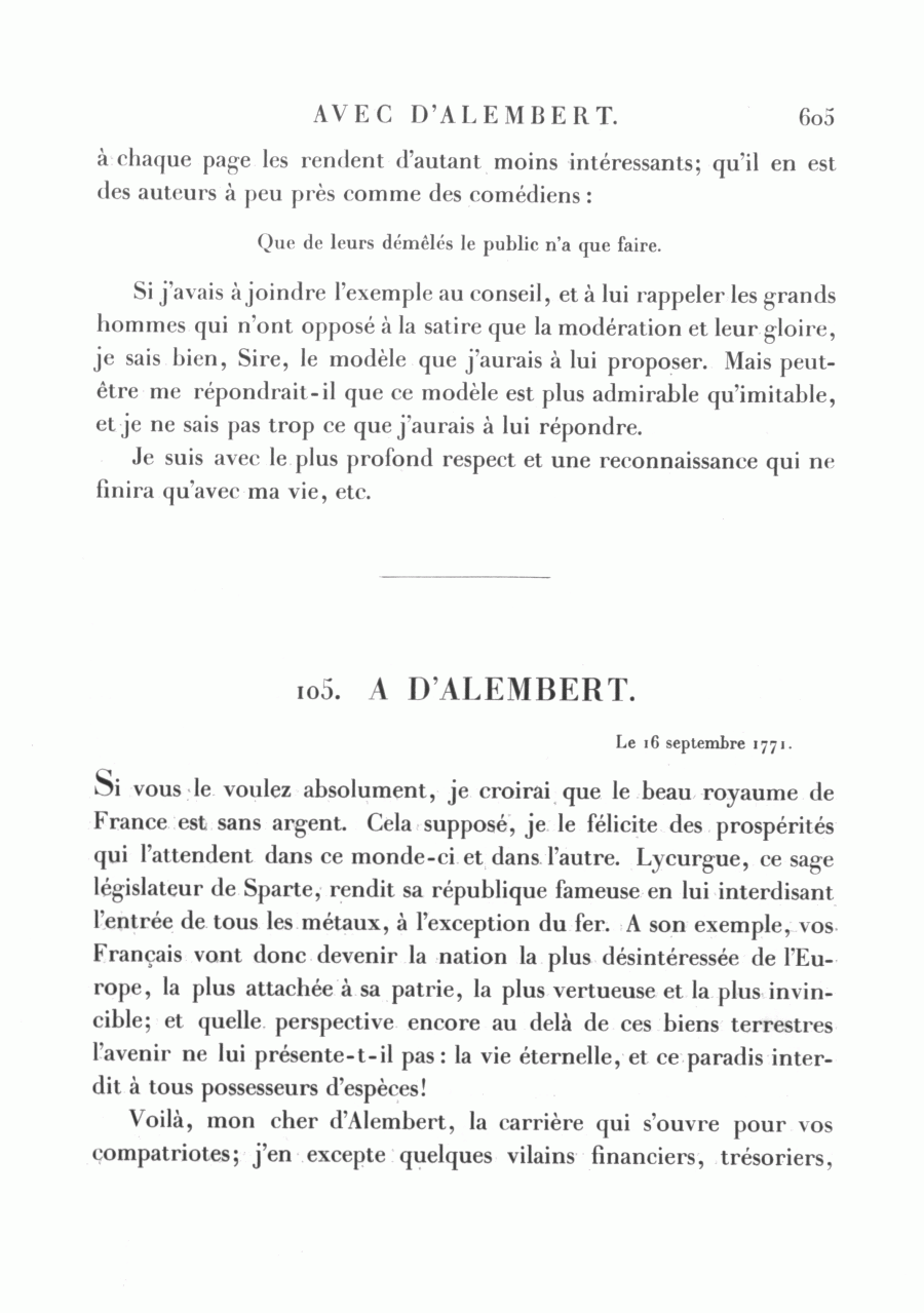 Voilà, mon cher d'Alembert, la carrière qui s'ouvre pour vos compatriotes; j'en excepte quelques vilains financiers, trésoriers,