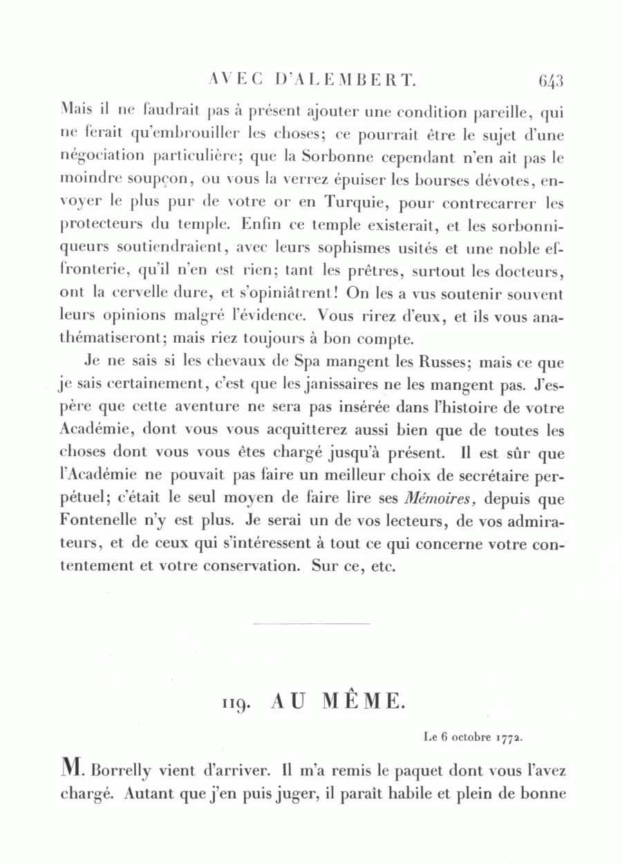 <643> Mais il ne faudrait pas à présent ajouter une condition pareille, qui ne ferait qu'embrouiller les choses; ce pourrait être le sujet d'une négociation particulière; que la Sorbonne cependant n'en ait pas le moindre soupçon, ou vous la verrez épuiser les bourses dévotes, envoyer le plus pur de votre or en Turquie, pour contrecarrer les protecteurs du temple. Enfin ce temple existerait, et les sorbonniqueurs soutiendraient, avec leurs sophismes usités et une noble effronterie, qu'il n'en est rien; tant les prêtres, surtout les docteurs, ont la cervelle dure, et s'opiniâtrent! On les a vus soutenir souvent leurs opinions malgré l'évidence. Vous rirez d'eux, et ils vous anathématiseront; mais riez toujours à bon compte.