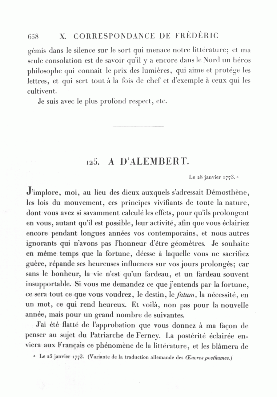 J'implore, moi, au lieu des dieux auxquels s'adressait Démosthène, les lois du mouvement, ces principes vivifiants de toute la nature, dont vous avez si savamment calculé les effets, pour qu'ils prolongent en vous, autant qu'il est possible, leur activité, afin que vous éclairiez encore pendant longues années vos contemporains, et nous autres ignorants qui n'avons pas l'honneur d'être géomètres. Je souhaite en même temps que la fortune, déesse à laquelle vous ne sacrifiez guère, répande ses heureuses influences sur vos jours prolongés; car sans le bonheur, la vie n'est qu'un fardeau, et un fardeau souvent insupportable. Si vous me demandez ce que j'entends par la fortune, ce sera tout ce que vous voudrez, le destin, le fatum, la nécessité, en un mot, ce qui rend heureux. Et voilà, non pas pour la nouvelle année, mais pour un grand nombre de suivantes.