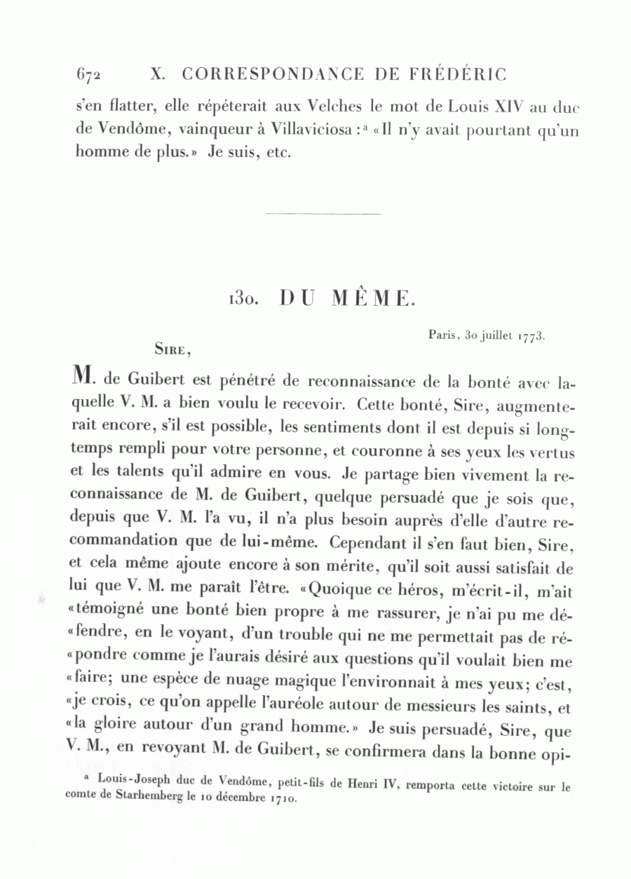M. de Guibert est pénétré de reconnaissance de la bonté avec laquelle V. M. a bien voulu le recevoir. Cette bonté, Sire, augmenterait encore, s'il est possible, les sentiments dont il est depuis si longtemps rempli pour votre personne, et couronne à ses yeux les vertus et les talents qu'il admire en vous. Je partage bien vivement la reconnaissance de M. de Guibert, quelque persuadé que je sois que, depuis que V. M. l'a vu, il n'a plus besoin auprès d'elle d'autre recommandation que de lui-même. Cependant il s'en faut bien, Sire, et cela même ajoute encore à son mérite, qu'il soit aussi satisfait de lui que V. M. me paraît l'être. « Quoique ce héros, m'écrit-il, m'ait témoigné une bonté bien propre à me rassurer, je n'ai pu me défendre, en le voyant, d'un trouble qui ne me permettait pas de répondre comme je l'aurais désiré aux questions qu'il voulait bien me faire; une espèce de nuage magique l'environnait à mes yeux; c'est, je crois, ce qu'on appelle l'auréole autour de messieurs les saints, et la gloire autour d'un grand homme. » Je suis persuadé, Sire, que V. M., en revoyant M. de Guibert, se confirmera dans la bonne opi-