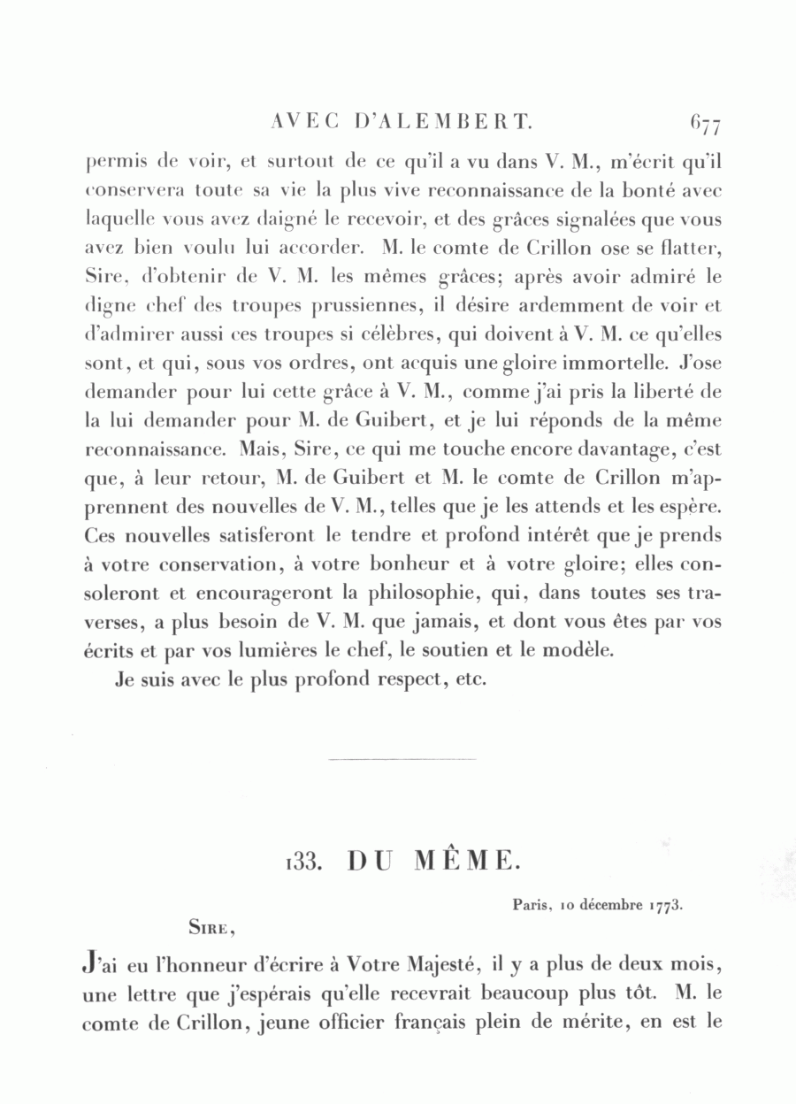 <677> permis de voir, et surtout de ce qu'il a vu dans V. M., m'écrit qu'il conservera toute sa vie la plus vive reconnaissance de la bonté avec laquelle vous avez daigné le recevoir, et des grâces signalées que vous avez bien voulu lui accorder. M. le comte de Crillon ose se flatter, Sire, d'obtenir de V. M. les mêmes grâces; après avoir admiré le digne chef des troupes prussiennes, il désire ardemment de voir et d'admirer aussi ces troupes si célèbres, qui doivent à V. M. ce qu'elles sont, et qui, sous vos ordres, ont acquis une gloire immortelle. J'ose demander pour lui cette grâce à V. M., comme j'ai pris la liberté de la lui demander pour M. de Guibert, et je lui réponds de la même reconnaissance. Mais, Sire, ce qui me touche encore davantage, c'est que, à leur retour, M. de Guibert et M. le comte de Crillon m'apprennent des nouvelles de V. M., telles que je les attends et les espère. Ces nouvelles satisferont le tendre et profond intérêt que je prends à votre conservation, à votre bonheur et à votre gloire; elles consoleront et encourageront la philosophie, qui, dans toutes ses traverses, a plus besoin de V. M. que jamais, et dont vous êtes par vos écrits et par vos lumières le chef, le soutien et le modèle. Je suis avec le plus profond respect, etc.