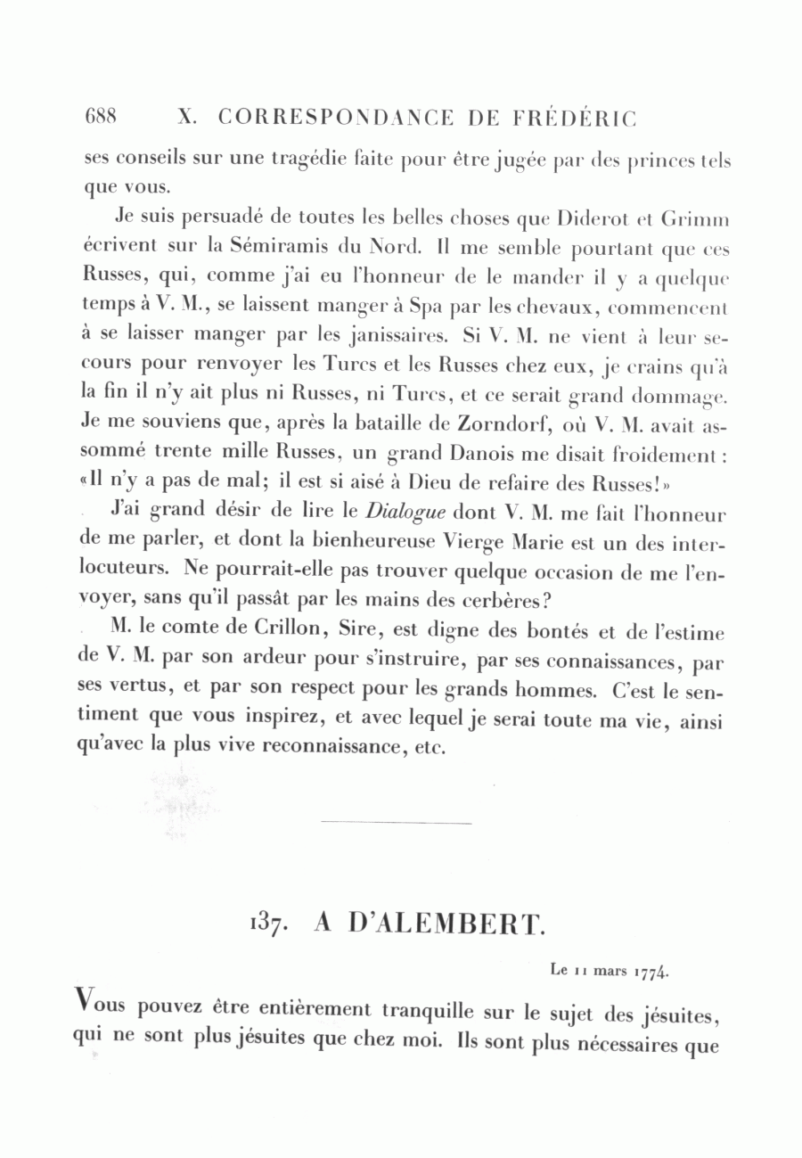 M. le comte de Crillon, Sire, est digne des bontés et de l'estime de V. M. par son ardeur pour s'instruire, par ses connaissances, par ses vertus, et par son respect pour les grands hommes. C'est le sentiment que vous inspirez, et avec lequel je serai toute ma vie, ainsi qu'avec la plus vive reconnaissance, etc.