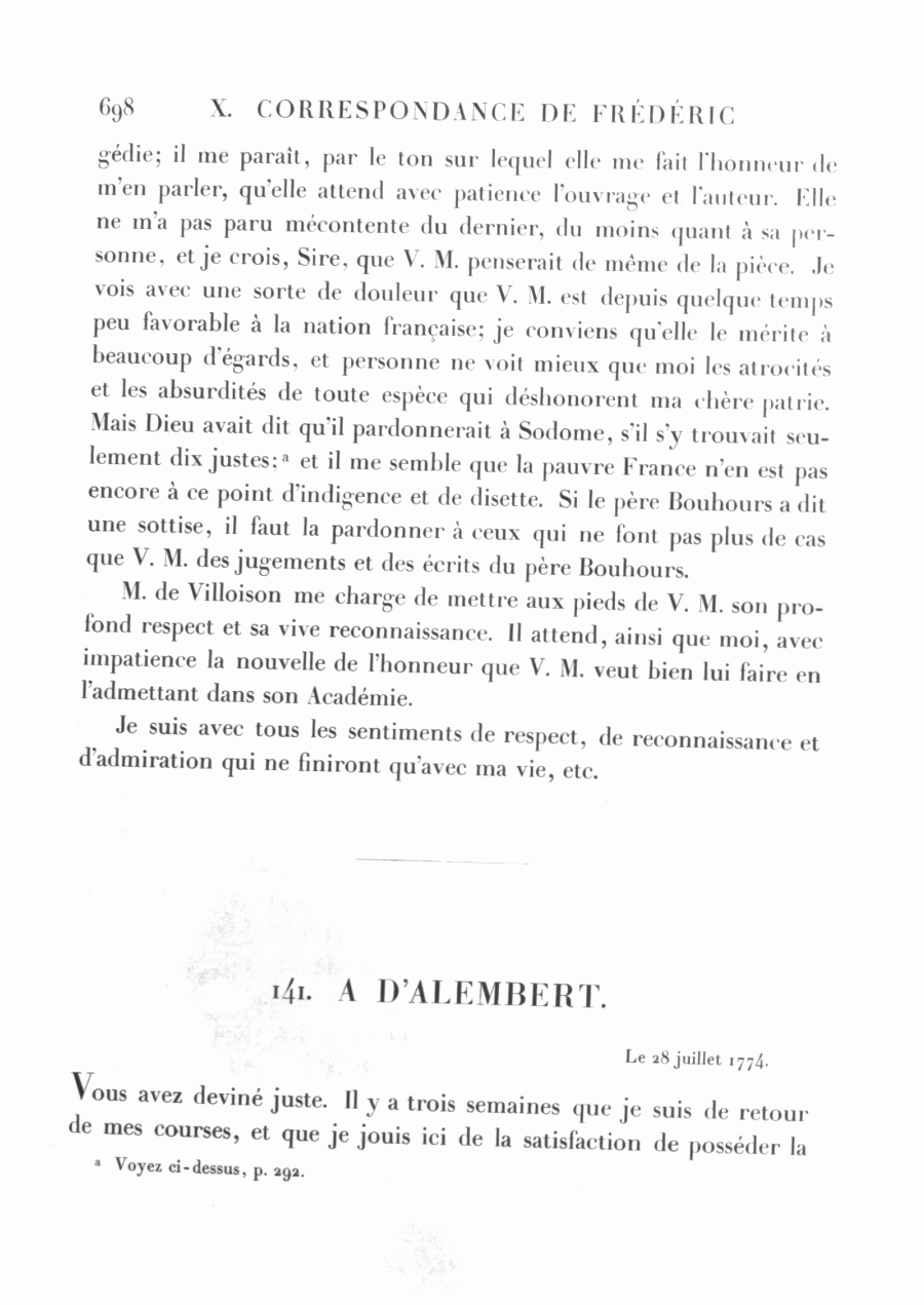 <698>gédie; il me paraît, par le ton sur lequel elle me fait l'honneur de m'en parler, qu'elle attend avec patience l'ouvrage et l'auteur. Elle ne m'a pas paru mécontente du dernier, du moins quant à sa personne, et je crois, Sire, que V. M. penserait de même de la pièce. Je vois avec une sorte de douleur que V. M. est depuis quelque temps peu favorable à la nation française; je conviens qu'elle le mérite à beaucoup d'égards, et personne ne voit mieux que moi les atrocités et les absurdités de toute espèce qui déshonorent ma chère patrie. Mais Dieu avait dit qu'il pardonnerait à Sodome, s'il s'y trouvait seulement dix justes;a et il me semble que la pauvre France n'en est pas encore à ce point d'indigence et de disette. Si le père Bouhours a dit une sottise, il faut la pardonner à ceux qui ne font pas plus de cas que V. M. des jugements et des écrits du père Bouhours.