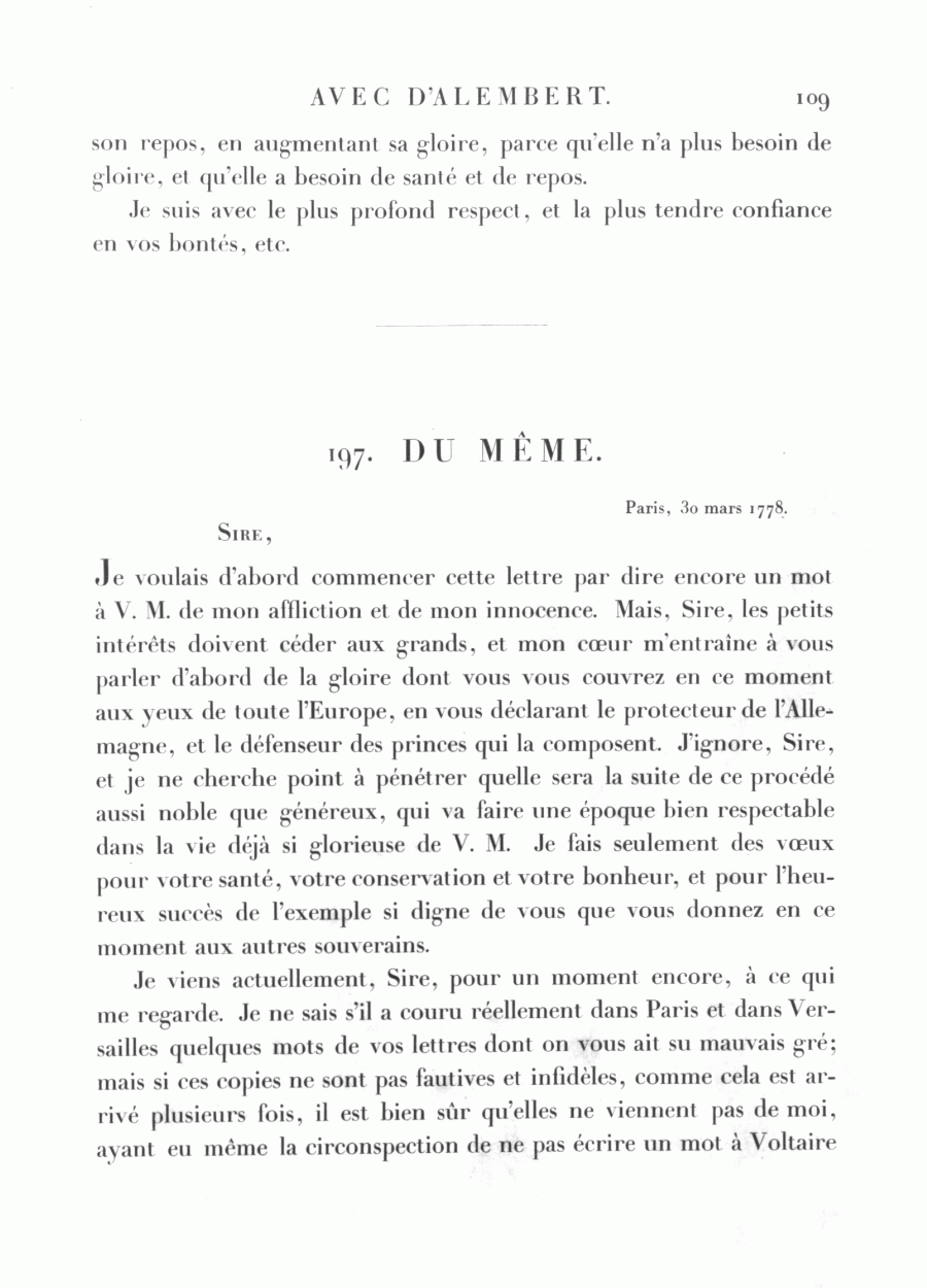Je viens actuellement, Sire, pour un moment encore, à ce qui me regarde. Je ne sais s'il a couru réellement dans Paris et dans Versailles quelques mots de vos lettres dont on vous ait su mauvais gré; mais si ces copies ne sont pas fautives et infidèles, comme cela est arrivé plusieurs fois, il est bien sûr qu'elles ne viennent pas de moi, ayant eu même la circonspection de ne pas écrire un mot à Voltaire