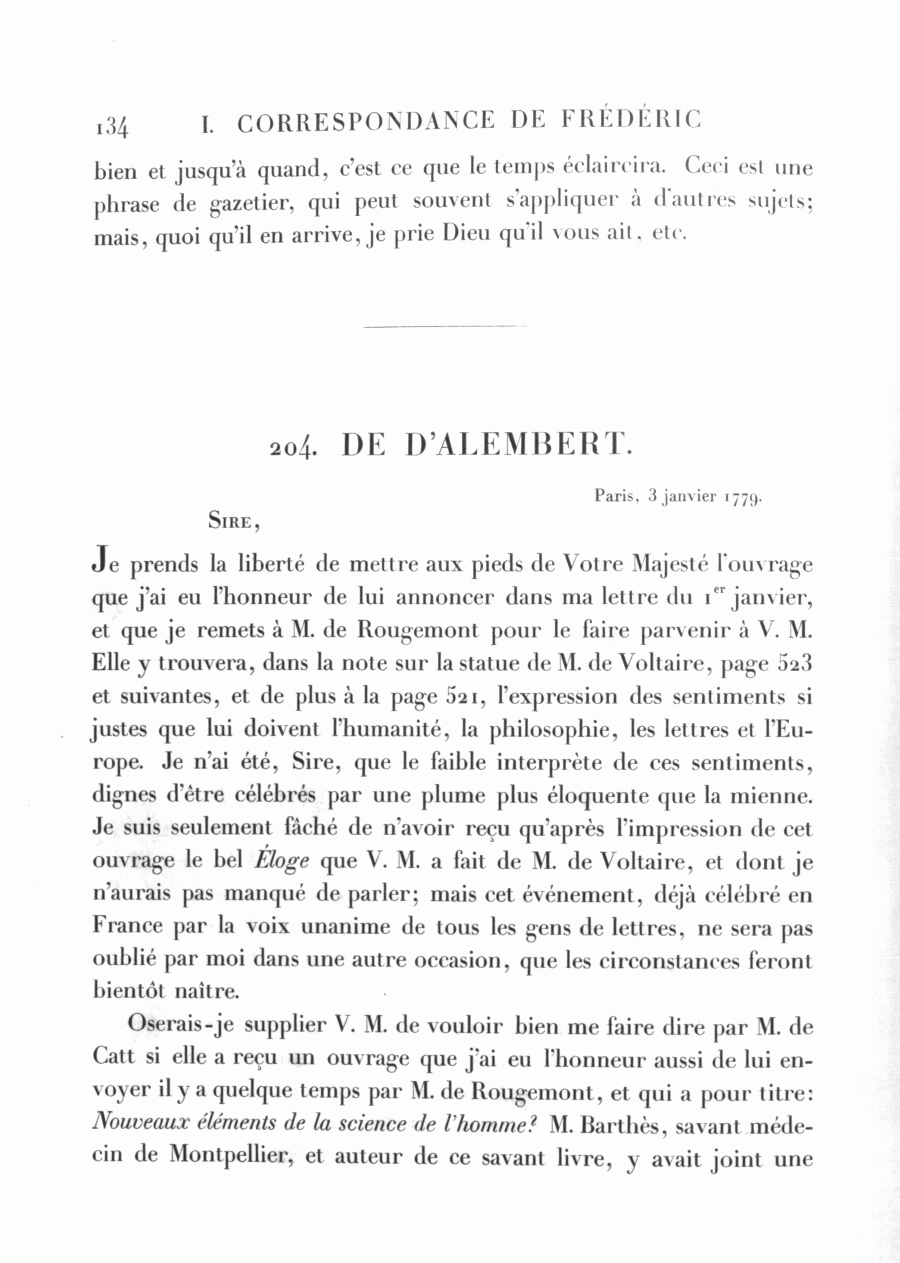 Je prends la liberté de mettre aux pieds de Votre Majesté l'ouvrage que j'ai eu l'honneur de lui annoncer dans ma lettre du 1er janvier, et que je remets à M. de Rougemont pour le faire parvenir à V. M. Elle y trouvera, dans la note sur la statue de M. de Voltaire, page 523 et suivantes, et de plus à la page 521, l'expression des sentiments si justes que lui doivent l'humanité, la philosophie, les lettres et l'Europe. Je n'ai été, Sire, que le faible interprète de ces sentiments, dignes d'être célébrés par une plume plus éloquente que la mienne. Je suis seulement fâché de n'avoir reçu qu'après l'impression de cet ouvrage le bel Éloge que V. M. a fait de M. de Voltaire, et dont je n'aurais pas manqué de parler; mais cet événement, déjà célébré en France par la voix unanime de tous les gens de lettres, ne sera pas oublié par moi dans une autre occasion, que les circonstances feront bientôt naître.