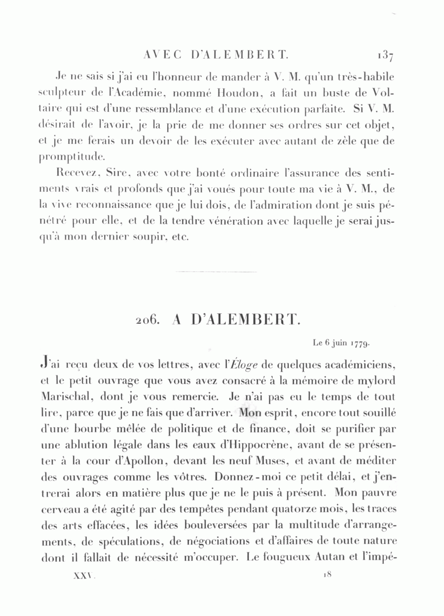 <137>Je ne sais si j'ai eu l'honneur de mander à V. M. qu'un très-habile sculpteur de l'Académie, nommé Houdon, a fait un buste de Voltaire qui est d'une ressemblance et d'une exécution parfaite. Si V. M. désirait de l'avoir, je la prie de me donner ses ordres sur cet objet, et je me ferais un devoir de les exécuter avec autant de zèle que de promptitude.