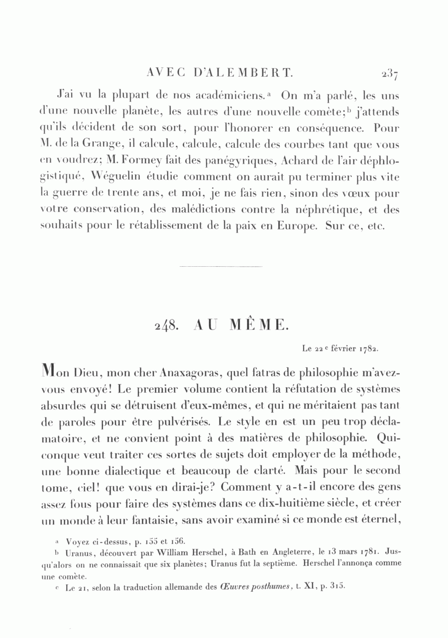 <237>J'ai vu la plupart de nos académiciens.a On m'a parlé, les uns d'une nouvelle planète, les autres d'une nouvelle comète;b j'attends qu'ils décident de son sort, pour l'honorer en conséquence. Pour M. de la Grange, il calcule, calcule, calcule des courbes tant que vous en voudrez; M. Formey fait des panégyriques, Achard de l'air déphlogistiqué, Wéguelin étudie comment on aurait pu terminer plus vite la guerre de trente ans, et moi, je ne fais rien, sinon des vœux pour votre conservation, des malédictions contre la néphrétique, et des souhaits pour le rétablissement de la paix en Europe. Sur ce, etc.
