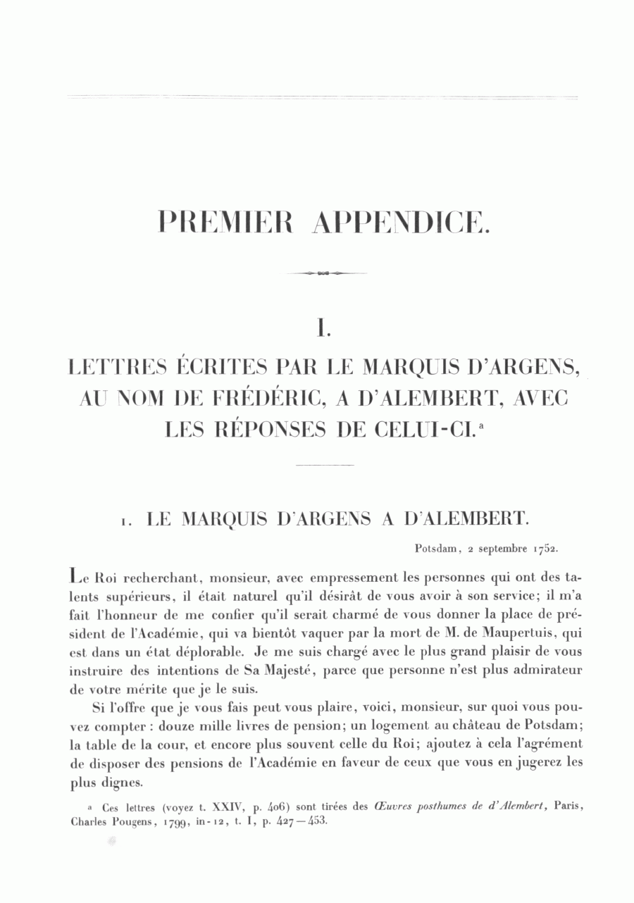 PREMIER APPENDICE. I. LETTRES ÉCRITES PAR LE MARQUIS D'ARGENS, AU NOM DE FRÉDÉRIC, A D'ALEMBERT, AVEC LES RÉPONSES DE CELUI-CI.a