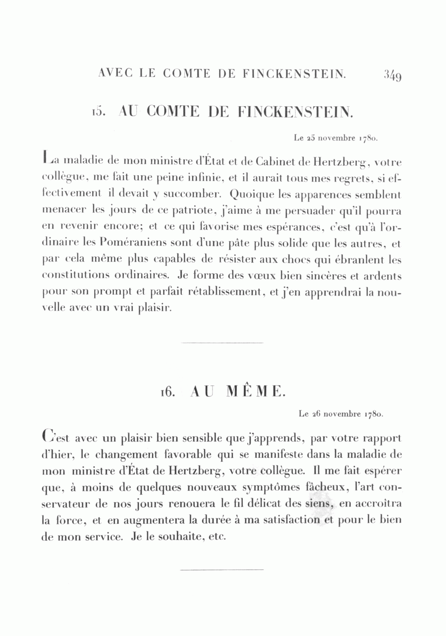 C'est avec un plaisir bien sensible que j'apprends, par votre rapport d'hier, le changement favorable qui se manifeste dans la maladie de mon ministre d'État de Hertzberg, votre collègue. Il me fait espérer que, à moins de quelques nouveaux symptômes fâcheux, l'art conservateur de nos jours renouera le fil délicat des siens, en accroîtra la force, et en augmentera la durée à ma satisfaction et pour le bien de mon service. Je le souhaite, etc.