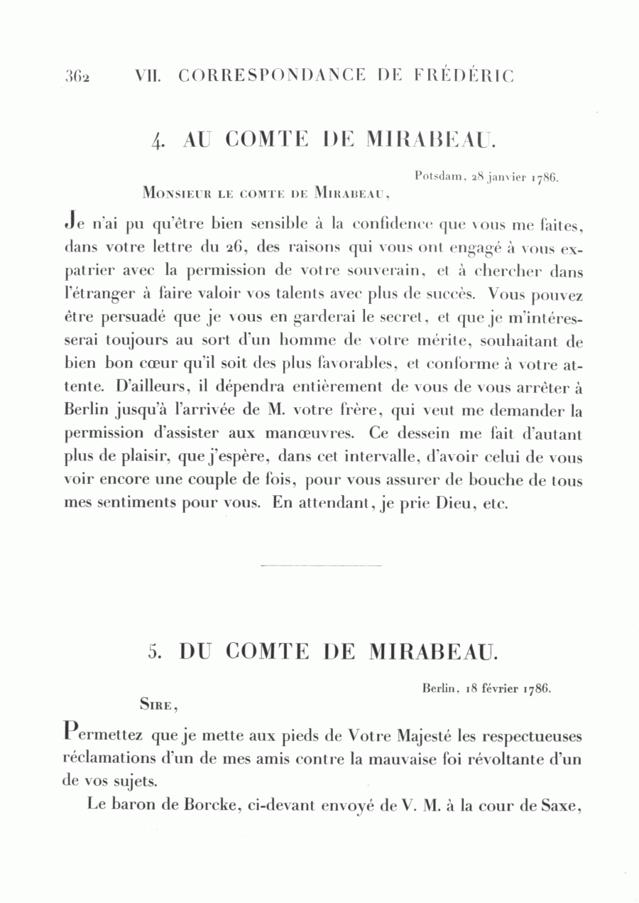 Correspondance de Frédéric avec Mirabeau (22 janvier - 15 avril 1786)