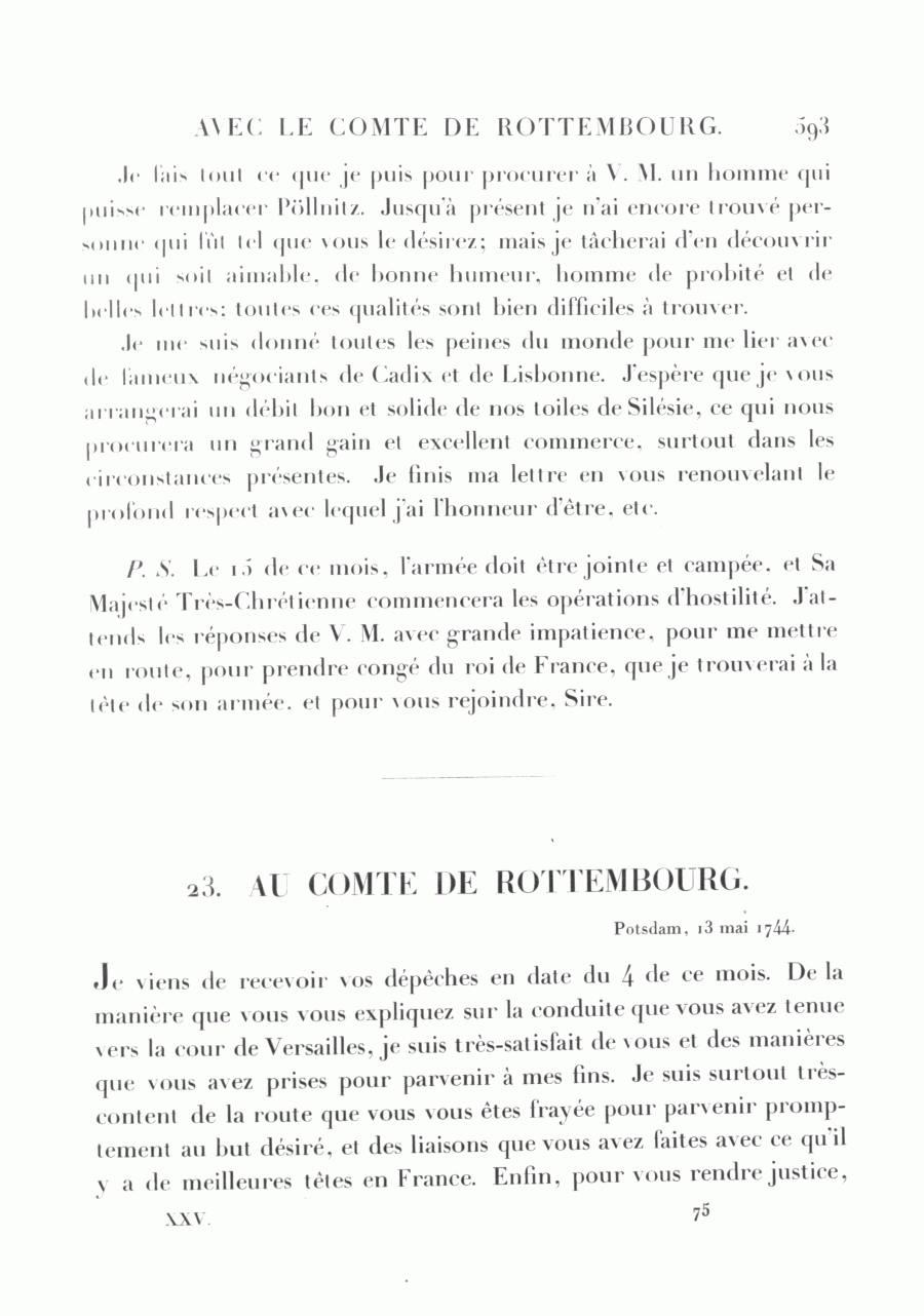 Je viens de recevoir vos dépêches en date du 4 de ce mois. De la manière que vous vous expliquez sur la conduite que vous avez tenue vers la cour de Versailles, je suis très-satisfait de vous et des manières que vous avez prises pour parvenir à mes fins. Je suis surtout très content de la route que vous vous êtes frayée pour parvenir promptement au but désiré, et des liaisons que vous avez faites avec ce qu'il y a de meilleures têtes en France. Enfin, pour vous rendre justice,