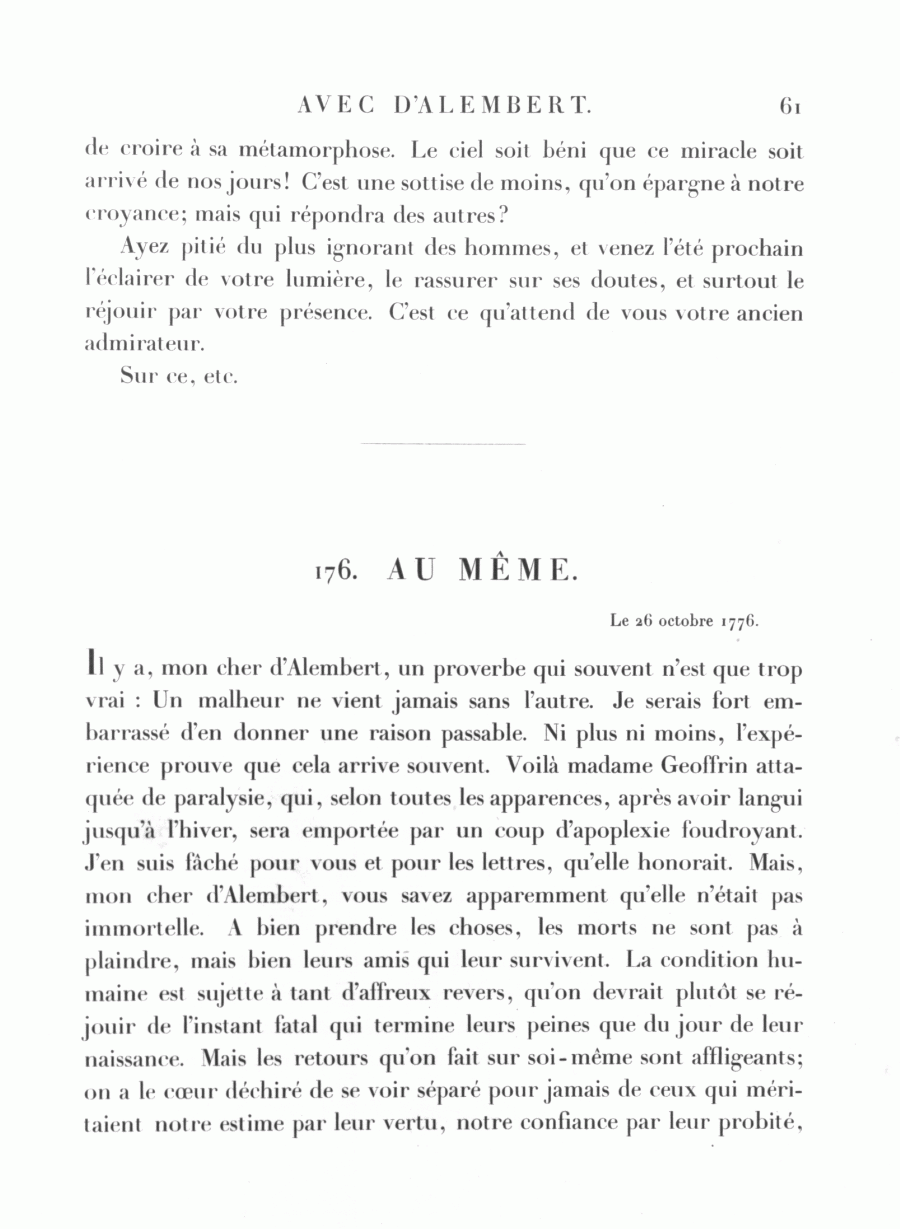 Il y a, mon cher d'Alembert, un proverbe qui souvent n'est que trop vrai : Un malheur ne vient jamais sans l'autre. Je serais fort embarrassé d'en donner une raison passable. Ni plus ni moins, l'expérience prouve que cela arrive souvent. Voilà madame Geoffrin attaquée de paralysie, qui, selon toutes les apparences, après avoir langui jusqu'à l'hiver, sera emportée par un coup d'apoplexie foudroyant. J'en suis lâché pour vous et pour les lettres, qu'elle honorait. Mais, mon cher d'Alembert, vous savez apparemment qu'elle n'était pas immortelle. A bien prendre les choses, les morts ne sont pas à plaindre, mais bien leurs amis qui leur survivent. La condition humaine est sujet le à tant d'affreux revers, qu'on devrait plutôt se réjouir de l'instant fatal qui termine leurs peines que du jour de leur naissance. Mais les retours qu'on fait sur soi-même sont affligeants; on a le cœur déchiré de se voir séparé pour jamais de ceux qui méritaient notre estime par leur vertu, notre confiance par leur probité.