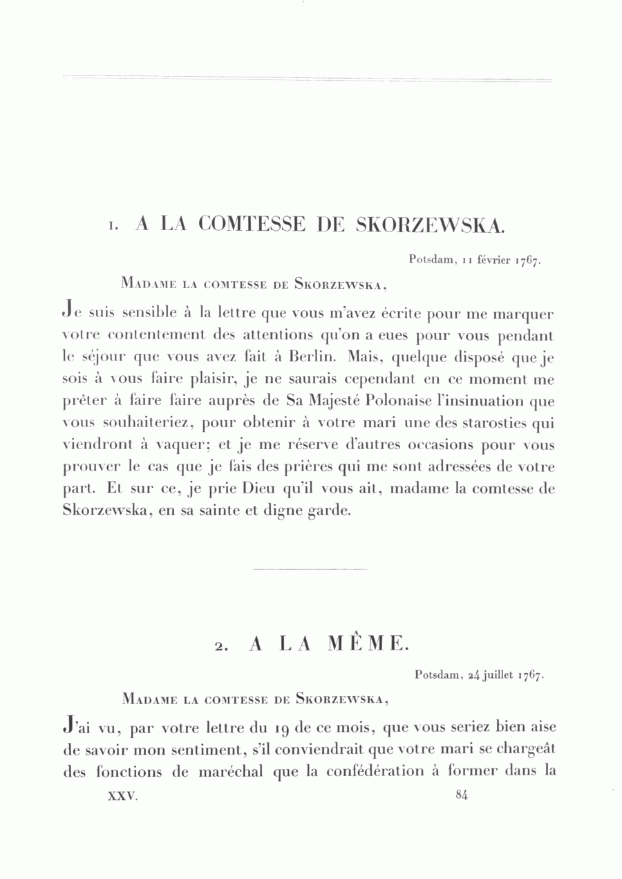 Je suis sensible à la lettre que vous m'avez écrite pour me marquer votre contentement des attentions qu'on a eues pour vous pendant le séjour que vous avez fait à Berlin. Mais, quelque disposé que je sois à vous faire plaisir, je ne saurais cependant en ce moment me prêter à faire faire auprès de Sa Majesté Polonaise l'insinuation que vous souhaiteriez, pour obtenir à votre mari une des starosties qui viendront à vaquer; et je me réserve d'autres occasions pour vous prouver le cas que je fais des prières qui me sont adressées de votre part. Et sur ce, je prie Dieu qu'il vous ait, madame la comtesse de Skorzewska, en sa sainte et digne garde.