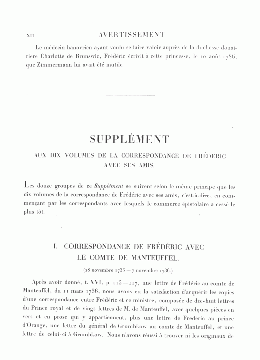 Les douze groupes de ce Supplément se suivent selon le même principe que les dix volumes de la correspondance de Frédéric avec ses amis, c'est-à-dire, en commençant par les correspondants avec lesquels le commerce épistolaire a cessé le plus tôt.