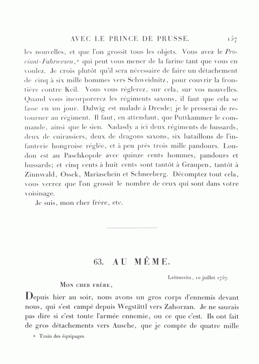 <157> les nouvelles, et que l'on grossit tous les objets. Vous avez le Proviant-Fuhrwesen,a qui peut vous mener de la farine tant que vous en voulez. Je crois plutôt qu'il sera nécessaire de faire un détachement de cinq à six mille hommes vers Schweidnitz, pour couvrir la frontière contre Keil. Vous vous réglerez, sur cela, sur vos nouvelles. Quand vous incorporerez les régiments saxons, il faut que cela se fasse en un jour. Dalwig est malade à Dresde; je le presserai de retourner au régiment. Il faut, en attendant, que Puttkammer le commande, ainsi que le sien. Nadasdy a ici deux régiments de hussards, deux de cuirassiers, deux de dragons saxons, six bataillons de l'infanterie hongroise réglée, et à peu près trois mille pandours. Loudon est au Paschkopole avec quinze cents hommes, pandours et hussards; et cinq cents à huit cents sont tantôt à Graupen, tantôt à Zinnwald, Ossek, Mariaschein et Schneeberg. Décomptez tout cela, vous verrez que l'on grossit le nombre de ceux qui sont dans votre voisinage.