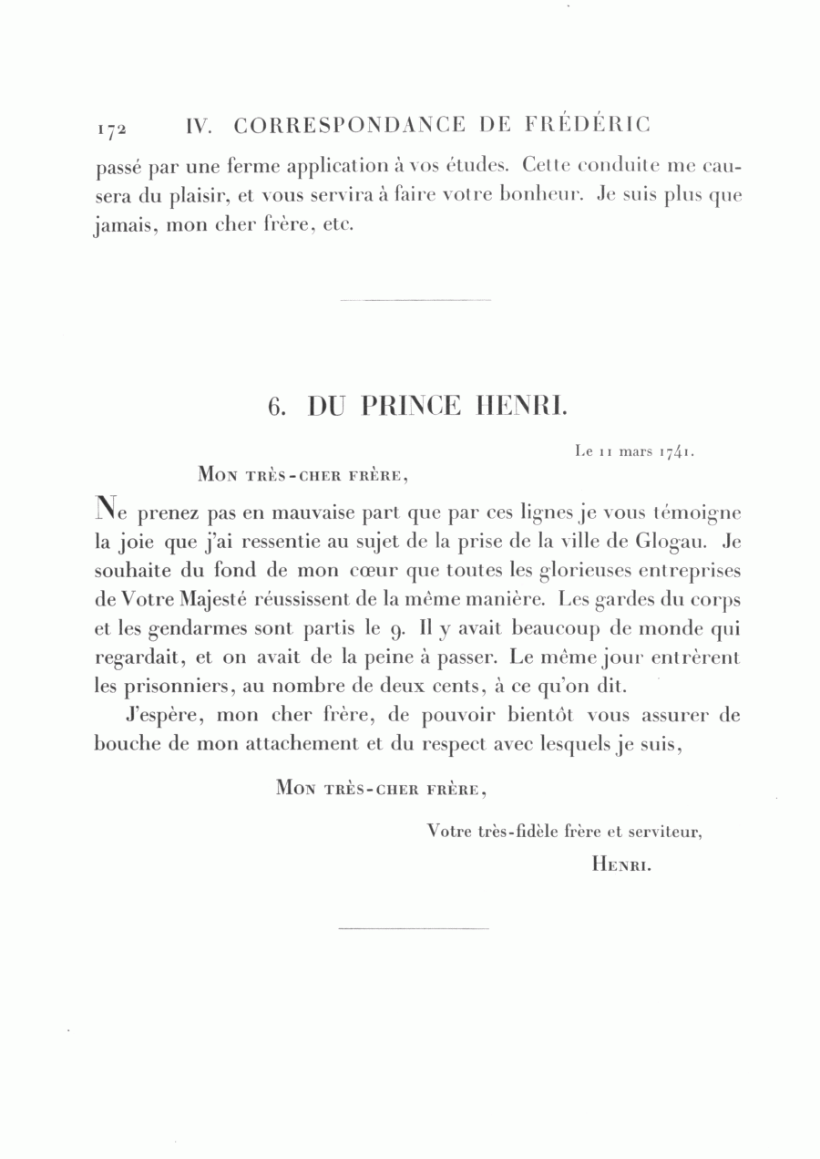 Ne prenez pas en mauvaise part que par ces lignes je vous témoigne la joie que j'ai ressentie au sujet de la prise de la ville de Glogau. Je souhaite du fond de mon cœur que toutes les glorieuses entreprises de Votre Majesté réussissent de la même manière. Les gardes du corps et les gendarmes sont partis le 9. Il y avait beaucoup de monde qui regardait, et on avait de la peine à passer. Le même jour entrèrent les prisonniers, au nombre de deux cents, à ce qu'on dit.