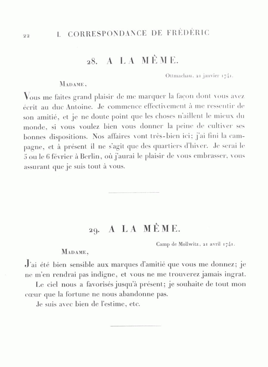 Vous me faites grand plaisir de me marquer la façon dont vous avez écrit au duc Antoine. Je commence effectivement à me ressentir de son amitié, et je ne doute point que les choses n'aillent le mieux du monde, si vous voulez bien vous donner la peine de cultiver ses bonnes dispositions. Nos affaires vont très-bien ici; j'ai fini la campagne, et à présent il ne s'agit que des quartiers d'hiver. Je serai le 5 ou le 6 février à Berlin, où j'aurai le plaisir de vous embrasser, vous assurant que je suis tout à vous.