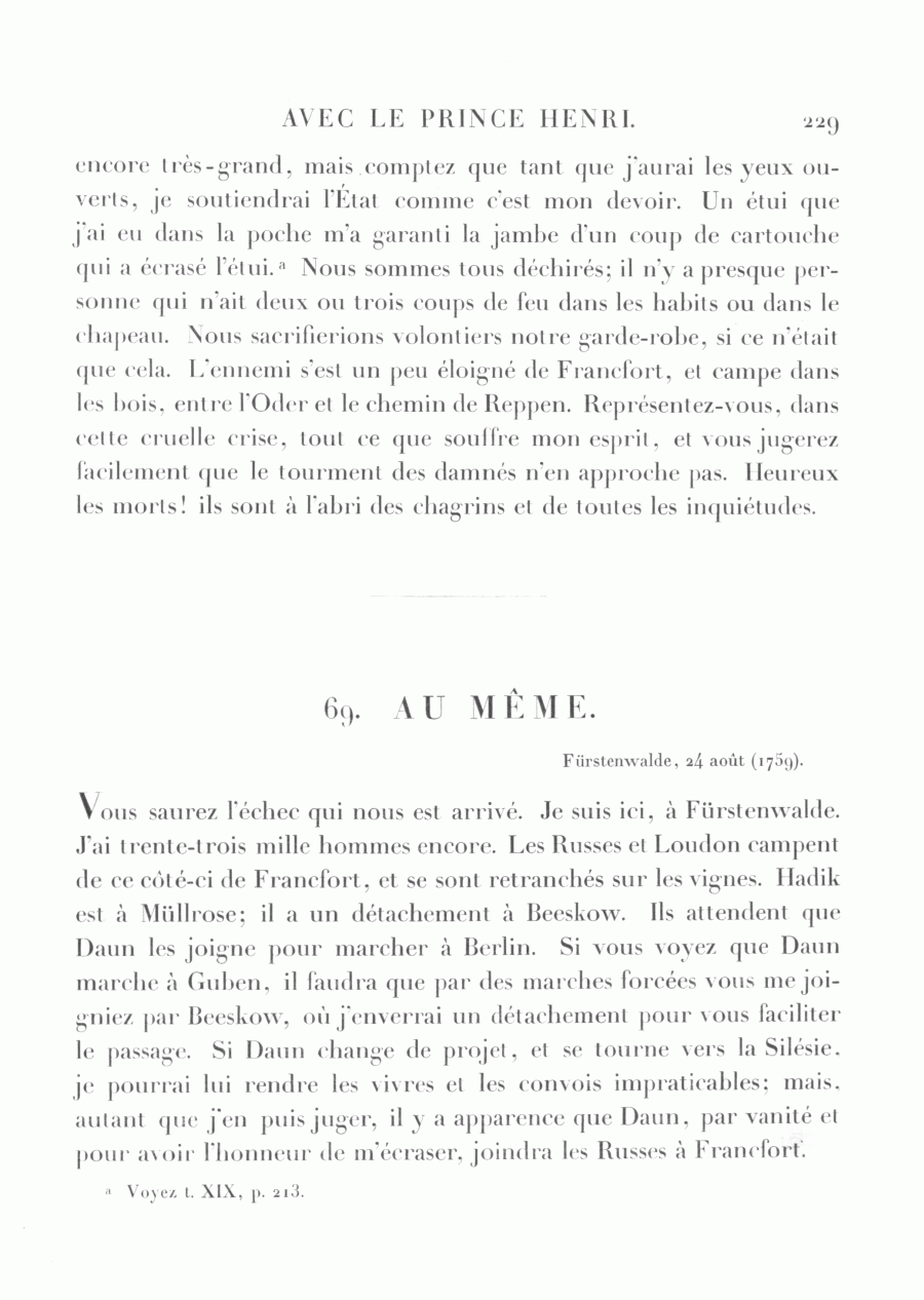 Vous saurez l'échec qui nous est arrivé. Je suis ici, à Fürstenwalde. J'ai trente-trois mille hommes encore. Les Russes et Loudon campent de ce côté-ci de Francfort, et se sont retranchés sur les vignes. Hadik est à Müllrose; il a un détachement à Beeskow. Ils attendent que Daun les joigne pour marcher à Berlin. Si vous voyez que Daun marche à Guben, il faudra que par des marches forcées vous me joigniez par Beeskow, où j'enverrai un détachement pour vous faciliter le passage. Si Daun change de projet, et se tourne vers la Silésie, je pourrai lui rendre les vivres et les convois impraticables; mais, autant que j'en puis juger, il y a apparence que Daun, par vanité et pour avoir l'honneur de m'écraser, joindra les Russes à Francfort.