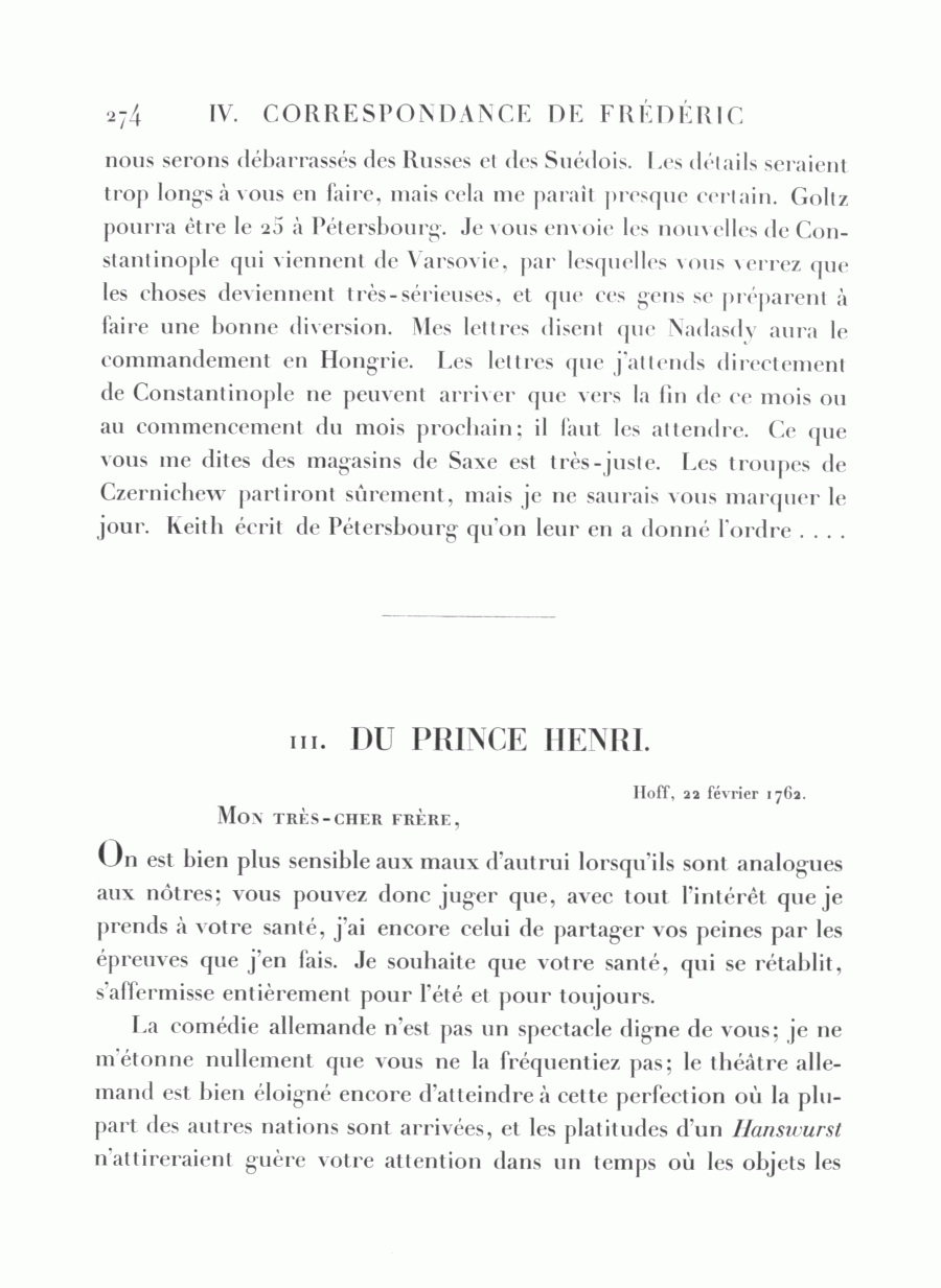 <274> nous serons débarrassés des Russes et des Suédois. Les détails seraient trop longs à vous en faire, mais cela me parait presque certain. Goltz pourra être le 25 à Pétersbourg. Je vous envoie les nouvelles de Constantinople qui viennent de Varsovie, par lesquelles vous verrez que les choses deviennent très-sérieuses, et que ces gens se préparent à faire une bonne diversion. Mes lettres disent que Nadasdy aura le commandement en Hongrie. Les lettres que j'attends directement de Constantinople ne peuvent arriver que vers la fin de ce mois ou au commencement du mois prochain; il faut les attendre. Ce que vous me dites des magasins de Saxe est très-juste. Les troupes de Czernichew partiront sûrement, mais je ne saurais vous marquer le jour. Keith écrit de Pétersbourg qu'on leur en a donné l'ordre ....