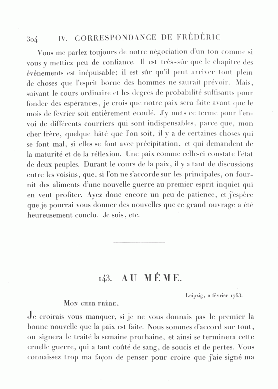 <304>Vous me parlez toujours de notre négociation d'un ton comme si vous y mettiez peu de confiance. Il est très-sûr que le chapitre des événements est inépuisable; il est sûr qu'il peut arriver tout plein de choses que l'esprit borné des hommes ne saurait prévoir. Mais, suivant le cours ordinaire et les degrés de probabilité suffisants pour fonder des espérances, je crois que notre paix sera faite avant que le mois de février soit entièrement écoulé. J'y mets ce terme pour l'envoi de différents courriers qui sont indispensables, parce que, mon cher frère, quelque hâté que l'on soit, il y a de certaines choses qui se font mal, si elles se font avec précipitation, et qui demandent de la maturité et de la réflexion. Une paix comme celle-ci constate l'état de deux peuples. Durant le cours de la paix, il y a tant de discussions entre les voisins, que, si l'on ne s'accorde sur les principales, on fournit des aliments d'une nouvelle guerre au premier esprit inquiet qui en veut profiter. Ayez donc encore un peu de patience, et j'espère que je pourrai vous donner des nouvelles que ce grand ouvrage a été heureusement conclu. Je suis, etc.