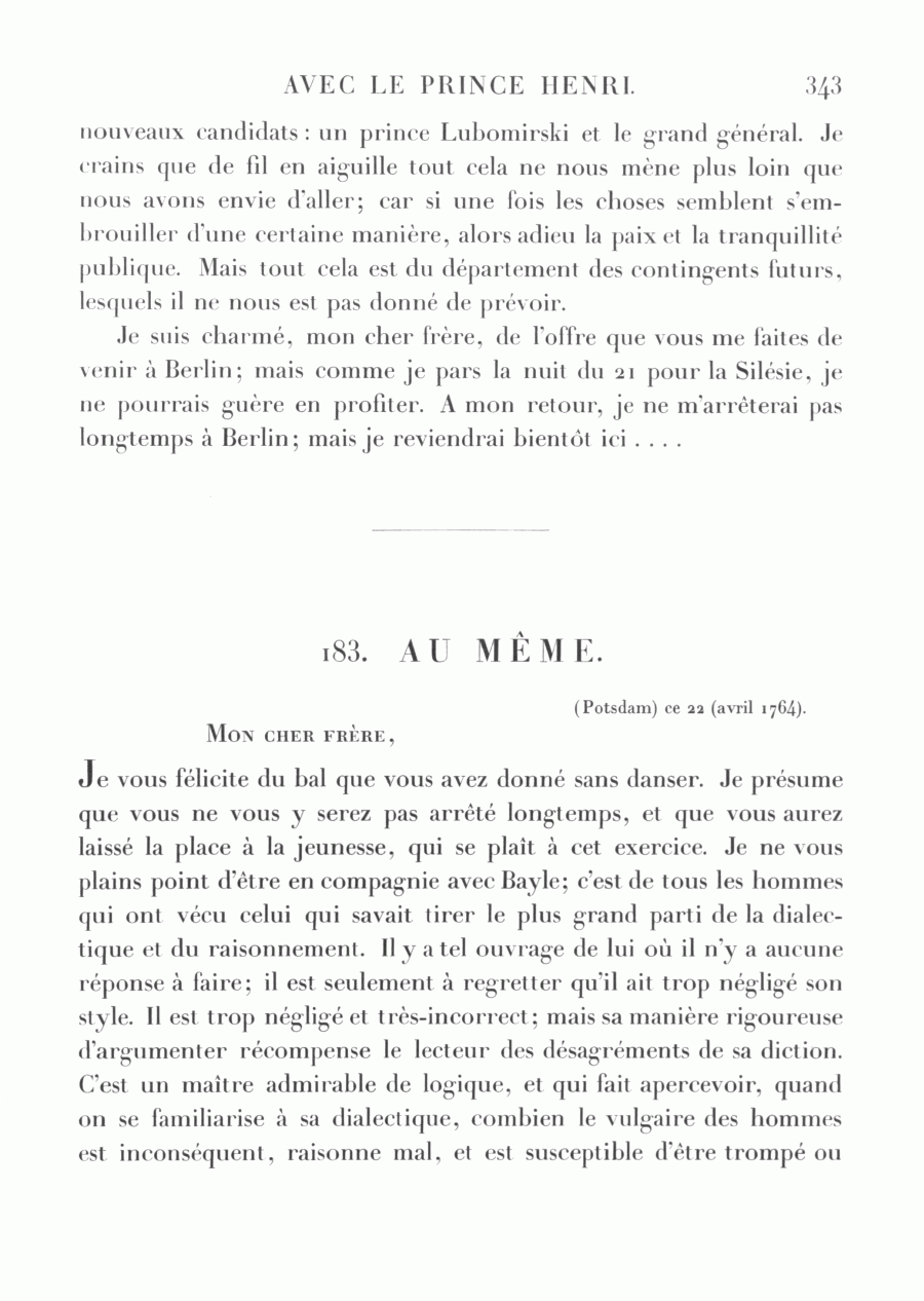 Je vous félicite du bal que vous avez donné sans danser. Je présume que vous ne vous y serez pas arrêté longtemps, et que vous aurez laissé la place à la jeunesse, qui se plaît à cet exercice. Je ne vous plains point d'être en compagnie avec Bayle; c'est de tous les hommes qui ont vécu celui qui savait tirer le plus grand parti de la dialectique et du raisonnement. Il y a tel ouvrage de lui où il n'y a aucune réponse à faire; il est seulement à regretter qu'il ait trop négligé son style. Il est trop négligé et très-incorrect; mais sa manière rigoureuse d'argumenter récompense le lecteur des désagréments de sa diction. C'est un maître admirable de logique, et qui fait apercevoir, quand on se familiarise à sa dialectique, combien le vulgaire des hommes est inconséquent, raisonne mal, et est susceptible d'être trompé ou