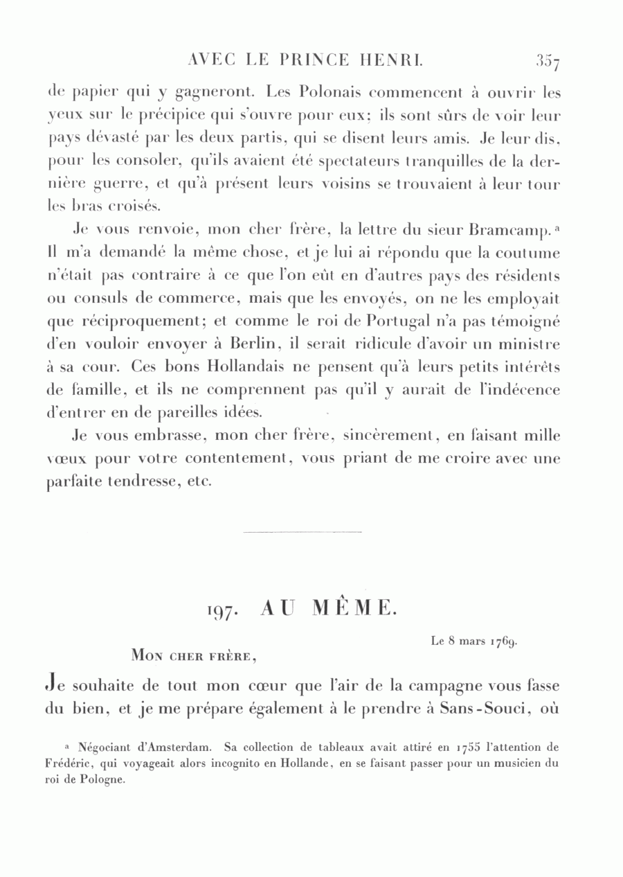 Je vous renvoie, mon cher frère, la lettre du sieur Bramcamp.a Il m'a demandé la même chose, et je lui ai répondu que la coutume n'était pas contraire à ce que l'on eût en d'autres pays des résidents ou consuls de commerce, mais que les envoyés, on ne les employait que réciproquement; et comme le roi de Portugal n'a pas témoigné d'en vouloir envoyer à Berlin, il serait ridicule d'avoir un ministre à sa cour. Ces bons Hollandais ne pensent qu'à leurs petits intérêts de famille, et ils ne comprennent pas qu'il y aurait de l'indécence d'entrer en de pareilles idées.