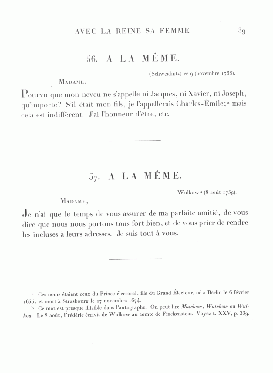 Pourvu que mon neveu ne s'appelle ni Jacques, ni Xavier, ni Joseph, qu'importe? S'il était mon fils, je l'appellerais Charles-Émile;a mais cela est indifférent. J'ai l'honneur d'être, etc.