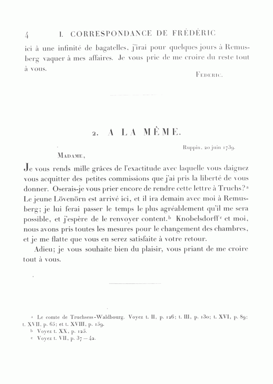 Je vous rends mille grâces de l'exactitude avec laquelle vous daignez vous acquitter des petites commissions que j'ai pris la liberté de vous donner. Oserais-je vous prier encore de rendre cette lettre à Truchs?a Le jeune Lövenörn est arrivé ici, et il ira demain avec moi à Remusberg; je lui ferai passer le temps le plus agréablement qu'il me sera possible, et j'espère de le renvoyer content.b Knobelsdorffc et moi, nous avons pris toutes les mesures pour le changement des chambres, et je me flatte que vous en serez satisfaite à votre retour.