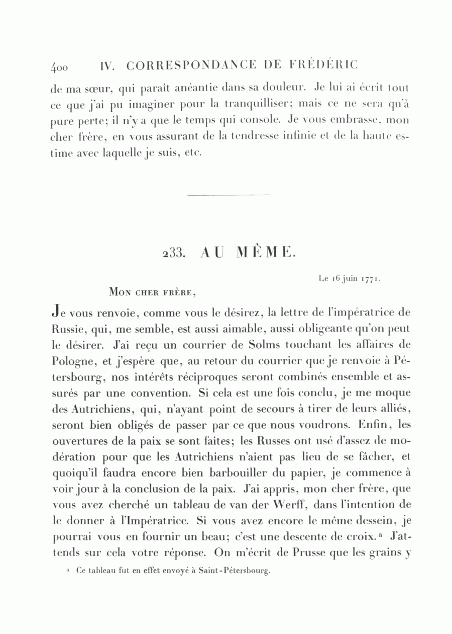 Je vous renvoie, comme vous le désirez, la lettre de l'impératrice de Russie, qui, me semble, est aussi aimable, aussi obligeante qu'on peut le désirer. J'ai reçu un courrier de Solms touchant les affaires de Pologne, et j'espère que, au retour du courrier que je renvoie à Pétersbourg, nos intérêts réciproques seront combinés ensemble et assurés par une convention. Si cela est une fois conclu, je me moque des Autrichiens, qui, n'ayant point de secours à tirer de leurs alliés, seront bien obligés de passer par ce que nous voudrons. Enfin, les ouvertures de la paix se sont faites; les Russes ont usé d'assez de modération pour que les Autrichiens n'aient pas lieu de se fâcher, et quoiqu'il faudra encore bien barbouiller du papier, je commence à voir jour à la conclusion de la paix. J'ai appris, mon cher frère, que vous avez cherché un tableau de van der Werff, dans l'intention de le donner à l'Impératrice. Si vous avez encore le même dessein, je pourrai vous en fournir un beau; c'est une descente de croix.a J'attends sur cela votre réponse. On m'écrit de Prusse que les grains y