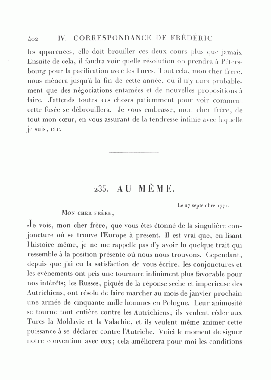 Je vois, mon cher frère, que vous êtes étonné de la singulière conjoncture où se trouve l'Europe à présent. Il est vrai que, en lisant l'histoire même, je ne me rappelle pas d'y avoir lu quelque trait qui ressemble à la position présente où nous nous trouvons. Cependant, depuis que j'ai eu la satisfaction de vous écrire, les conjonctures et les événements ont pris une tournure infiniment plus favorable pour nos intérêts; les Russes, piqués de la réponse sèche et impérieuse des Autrichiens, ont résolu de faire marcher au mois de janvier prochain une armée de cinquante mille hommes en Pologne. Leur animosité se tourne tout entière contre les Autrichiens; ils veulent céder aux Turcs la Moldavie et la Valachie, et ils veulent même animer cette puissance à se déclarer contre l'Autriche. Voici le moment de signer notre convention avec eux; cela améliorera pour moi les conditions
